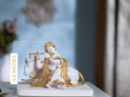Luxurious White & Gold Lord Krishna With Cow Idol (5.5 Inch)