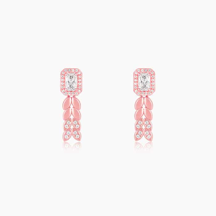 The Inspiration: The Rose Gold Braided Earrings are inspired by the memories of our childhood, sitting on the steps while our mother braided our hair. The Design: These rose gold earrings have a square design with zircons and four leaf-like designs attached at the bottom with the last two studded with zircons. 925 Silver with Rose Gold Plating Perfect for sensitive skin Size: Height –Â 2.5 cm, Width – 0.75 cm Comes with the Nikrish Jewellery kit and authenticity certificate Content: Earrings Net Qty- 1 pair Styling Tip: Style these earrings with a green top and skirt suit.