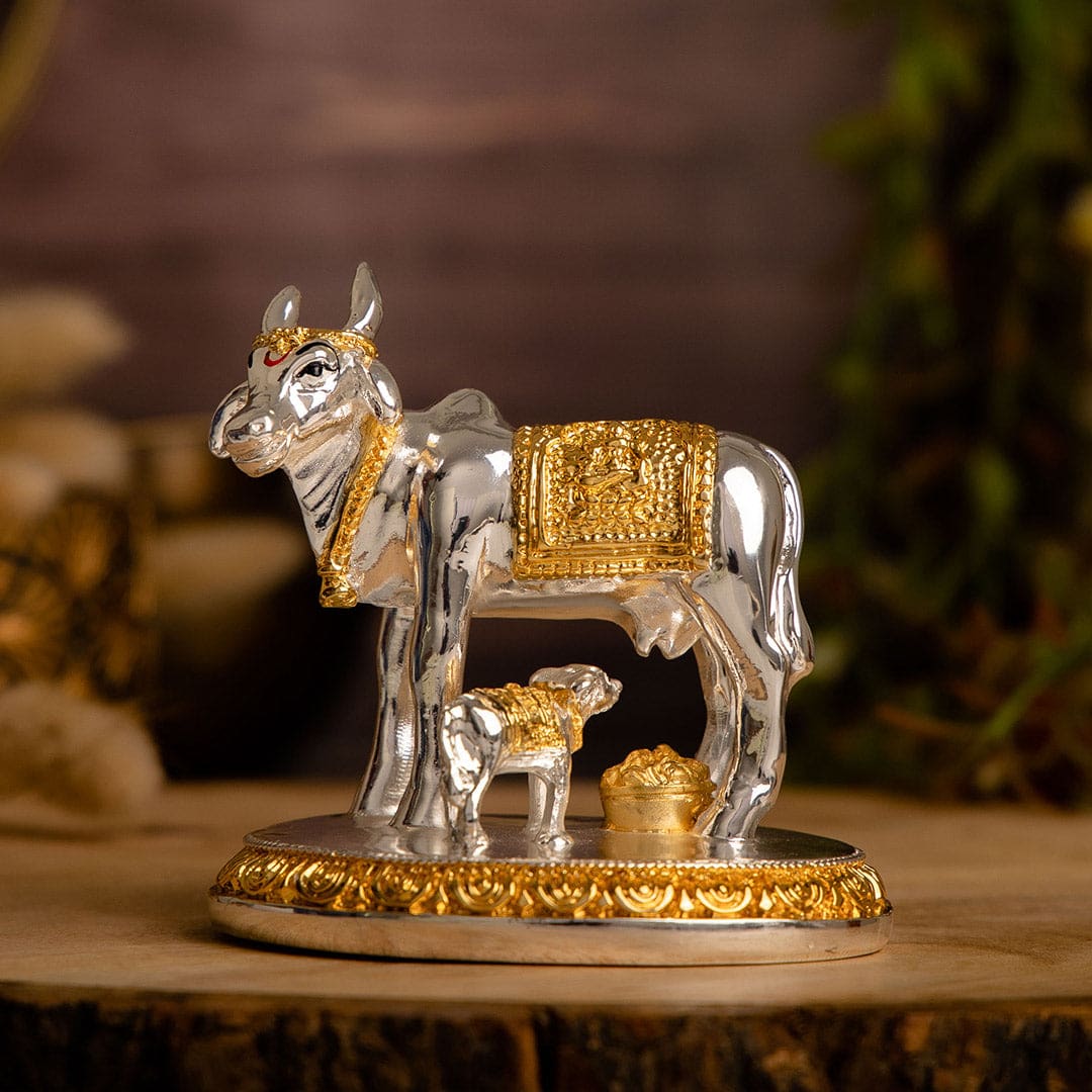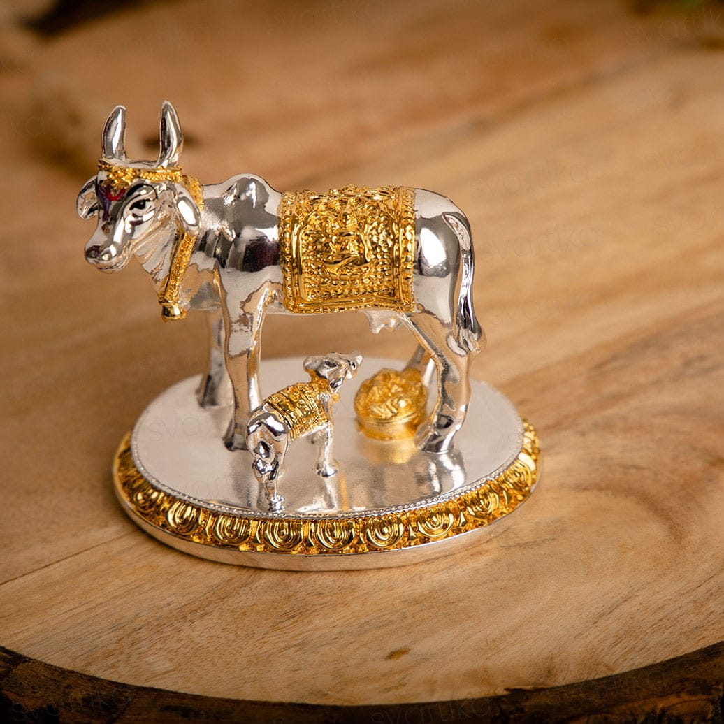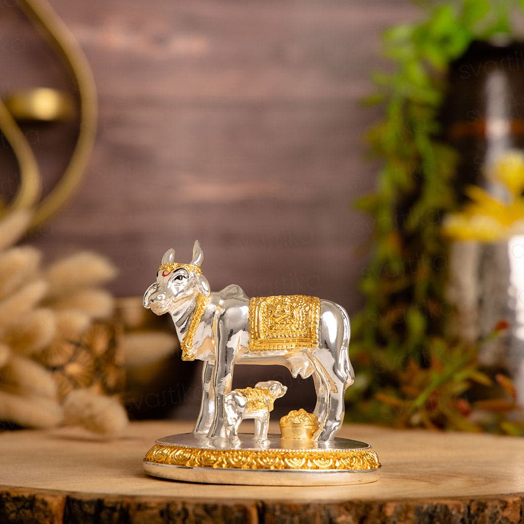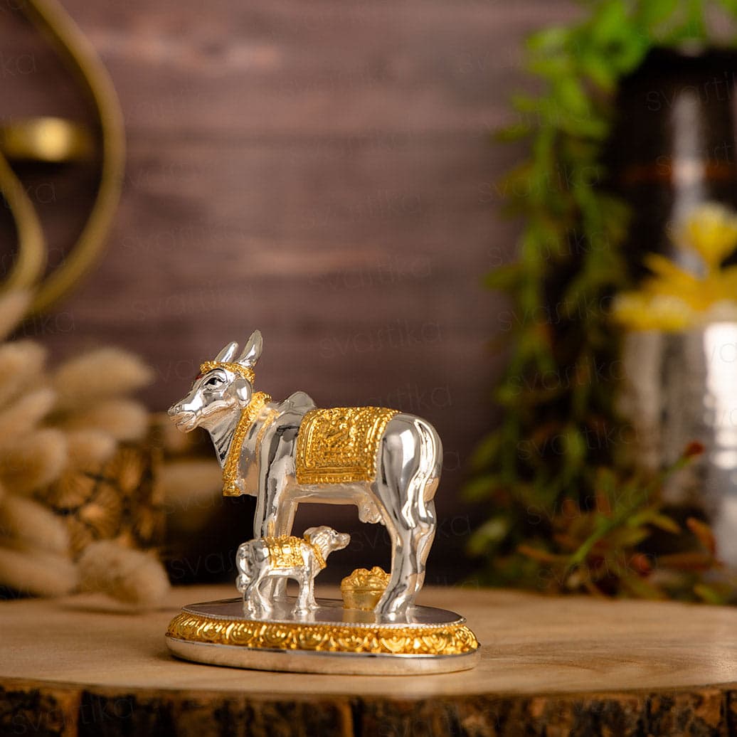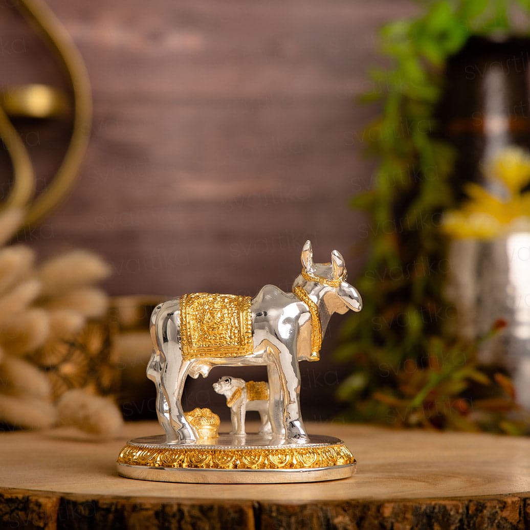 Cow and Calf status is gold plated with an antique finish making it look very beautiful. The Kamdhenu Cow idol is used for the purpose of worship and also for home decoration. It’s designed to look traditionally stylish and it is inspired from the days of royal touch. The epithets “Kamadhenu literally mean the cow from whom all that is desired is drawn”. It serves as a great gift, especially for religious celebrations and festivities. Kamdhenu Cow With Calf is hand made handcrafted items use it to religious worship of god & goddess. This Kamdhenu cow with Calf idol is 24 Karat Gold and Silver plated with terracotta color work for durability of this product. Its presence make positive effect, gives a peace with good luck & also correcting architectural defects (Vastudosh) Deviation/variation. This Kamdhenu idol is goregous Hand work and perfect showpiece of Indian Handicrafts. Gorgeous Hand work and perfect showpiece of Indian Handicrafts. Ideal For Home Decor, gifting & spiritual lucky gift, thanksgiving gift and more. Package Includes : Kamdhenu Cow with Calf Idol