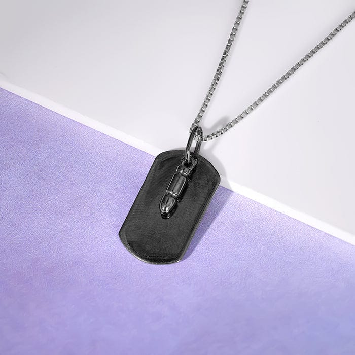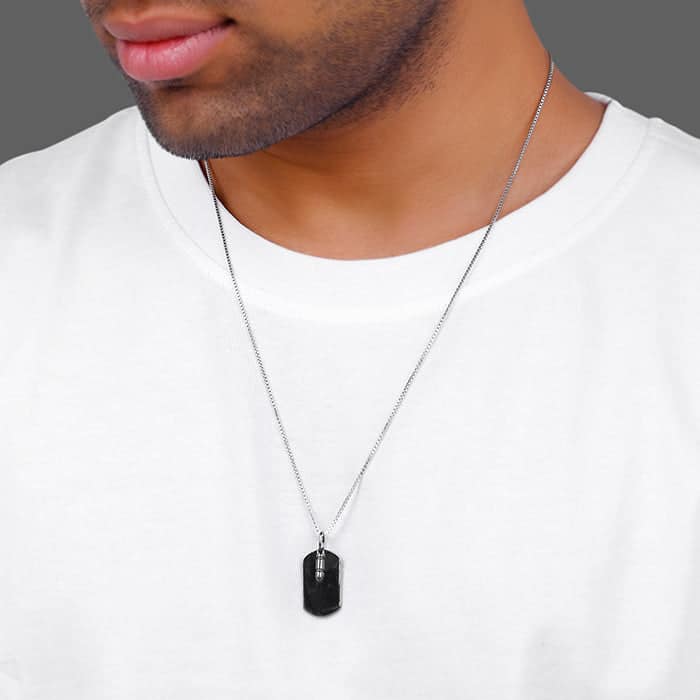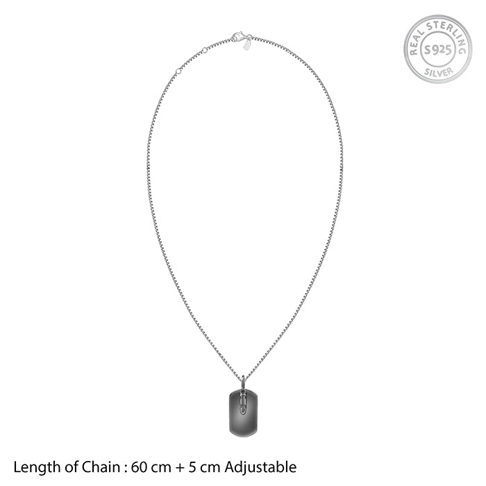 The Inspiration: A pendant built for the modern man who values style and substance. Stay ahead of the curve, effortlessly. The Design: This men’s black rhodium pendant with a box chain features a classic dog tag design. 925 Silver with Black Rhodium Finish Perfect for sensitive skin Length of Chain: 60 cm + 5 cm Adjustable Motif Height: 2.8 cm, Width: 1.3 cm Comes with the Nikrish Jewellery kit and authenticity certificate Content: Pendant With Box Chain Net Qty- 1 unit Styling Tip: Pair this pendant with a silver ring.