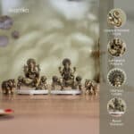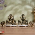 Discover our 4-inch brass Laxmi Ganesh murti set , featuring Lord Ganesha , Goddess Lakshmi , and a pair of auspicious elephants . This intricately crafted Lakshmi Ganesh Murti for home combines divine grace with artistic excellence, making it perfect for your sacred space or as a thoughtful gift . The Lord Ganesha murti , known as the Remover of Obstacles, stands alongside a radiant Lakshmi statue , invoking prosperity and abundance. The accompanying elephant statues, with upraised trunks, symbolize good fortune and welcome blessings into your home. This brass Lakshmi Ganesh idol set is ideal for pooja rooms, serving as both a spiritual centerpiece and an elegant decor item. As affordable Diwali gifts or housewarming gifts, they bring divine energy to any space. Whether for personal use or gifting during weddings, new beginnings, anniversaries, personal achievements, or sacred occasions, this Lakshmi Vinayaka idol set promises to infuse your home with auspiciousness and spiritual richness. It also makes a thoughtful gift for inaugurations or special ceremonies. Package Includes: No.1 – Lord Ganesha On Singhasan No.1 – Goddess Lakshmi On Singhasan No.1 – Brass Vastu Trunk Up Elephant Pair (Set Of 2) Note: This brass product is hollow from the inside. Note: The stand shown in the image is for photography purposes only and is not included with the idol.