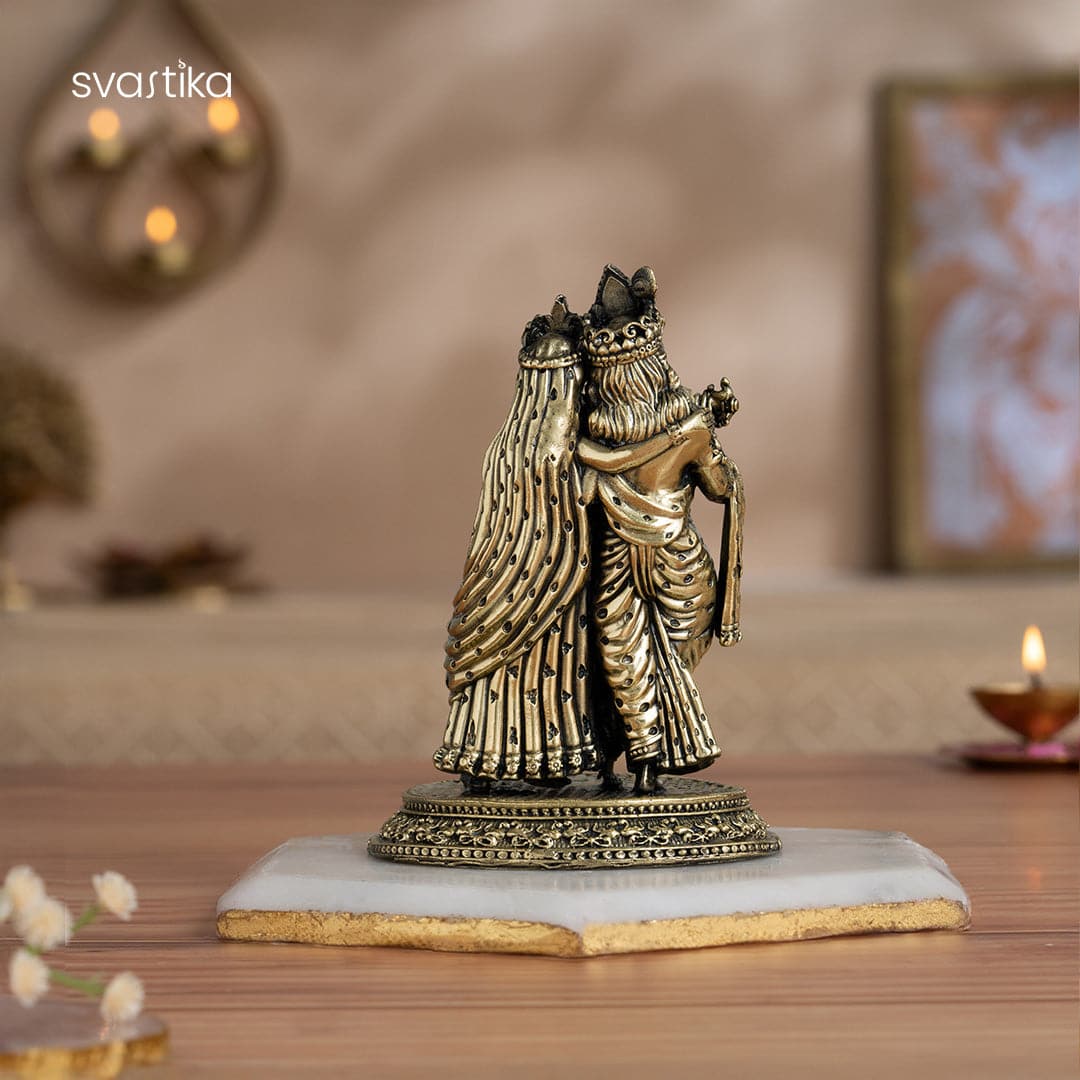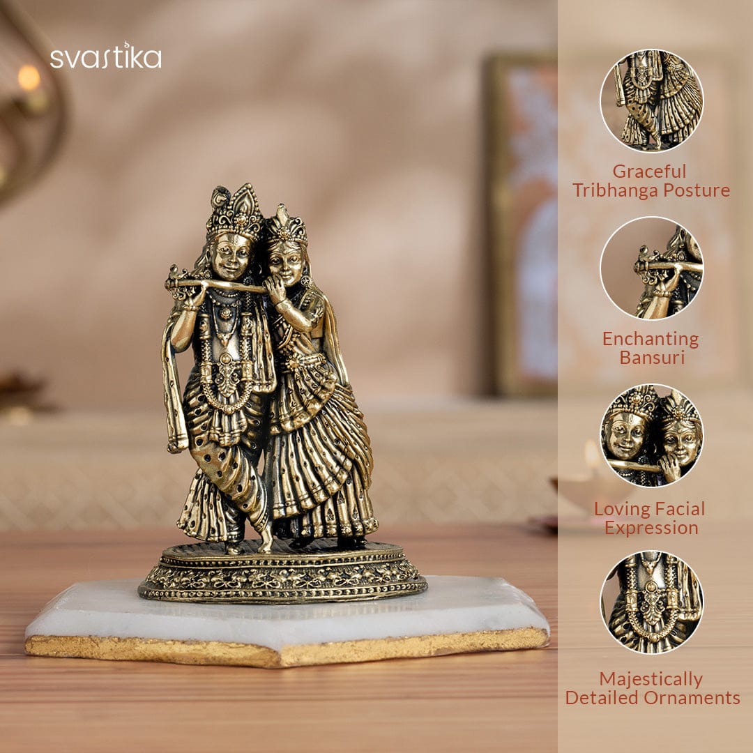 Experience the divine love of Radha-Krishna with this Brass Radha Krishna Murti . This 5″ Brij Ras Idol, a perfect Radha Krishna gift, captures the youthful charm of Lord Krishna standing in the graceful tribhanga posture, accompanied by his beloved Radha Rani. Crafted from premium brass idols, this exquisite brass statue is ideal for both spiritual decor and gifting. Intricately crafted from brass, Radha plays the heavenly bansuri flute, her right hand resting fondly on Shree Krishna’s shoulder while his right-hand holds one end of the flute. Their spiritual and emotional union is perfectly portrayed through this joint music-making, making it a truly beautiful Radha Krishna idol . Enshrine this vibrant Krishna and Radha idol in your pooja room or living space to infuse it with the eternal sweetness of Krishna’s divine love. It makes an ideal Radha Krishna murti for gifting during sacred occasions like weddings, housewarming ceremonies, and festivities like Diwali, Navratri, Krishna Janmashtami, and Holi. Let this Radha Krishna statue elevate your spiritual decor and celebrate the inseparable bond between the divine couple. Note: This brass product is hollow from the inside. Note: The stand shown in the image is for photography purposes only and is not included with the idol.