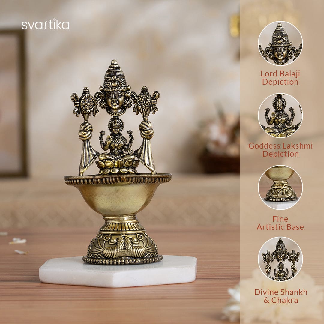 Brass Diya represent purity, goodness, hope, and power. Bring home this beautiful brass Lakshmi Tirupati Balaji Diya to illuminate your pooja room , temple, or mandir , or use it as an elegant diya home decor piece. This 5.5-inch brass diya lamp is crafted from premium brass and meticulously handcrafted in India, showcasing the rich artistry of Indian handicrafts. Featuring deities of Balaji , a revered form of Lord Vishnu, and Goddess Lakshmi, this Balaji Lakshmi brass diya is not just a lamp but a symbol of divine energy and spiritual power. The chakra represents divine energy, while the shankh symbolizes purity and creation, combining to embody holiness and sacredness. Perfect for prayer rituals and other auspicious celebrations, this brass diya for pooja radiates devotion and grace. When filled with oil, ghee, and a cotton wick, the brass diya produces a steady flame that symbolizes enlightenment, knowledge, and the dispelling of darkness. Whether for personal use or as a thoughtful diya gift for your loved ones. This diya for mandir will be a truly remarkable addition to any home. Note: This brass product is hollow from the inside. Note: The stand shown in the image is for photography purposes only and is not included with the idol.