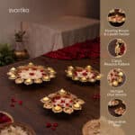 Illuminate your home with the sacred aura of the Svastika Diya Holder Peacock Urli (Set of 3) . Handcrafted gleaming metal, this exquisite set of 3 urli bowls blends traditional Indian home decor with floating diya candle holders for divine centerpieces. Each bowl’s intricate peacock design symbolizes nobility and purity . Durable metal with mesmerizing metallic Brass Finish , these urli bowl decorations withstand time. Integrated handles and lightweight design allow effortless arranging to complement your home decor. Place them in entryways, living rooms, or dining spaces , infusing radiant tranquility. The floating diyas cast a sacred ambiance for prayers, occasions, or Diwali . These magnificent water decoration items double as functional art, elevating your Indian decor with ornate beauty and divine illumination. Use as floral decorations with vibrant blooms or water flower decorations with floating candles. The Svastika Peacock Urli Bowls imbue your abode with an enchanting, timeless ambiance. Package Includes : Urli (Set of 3)
