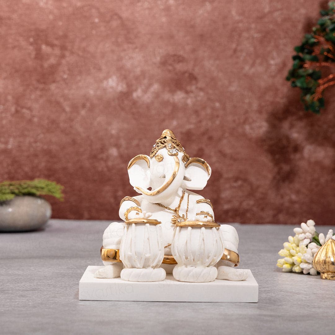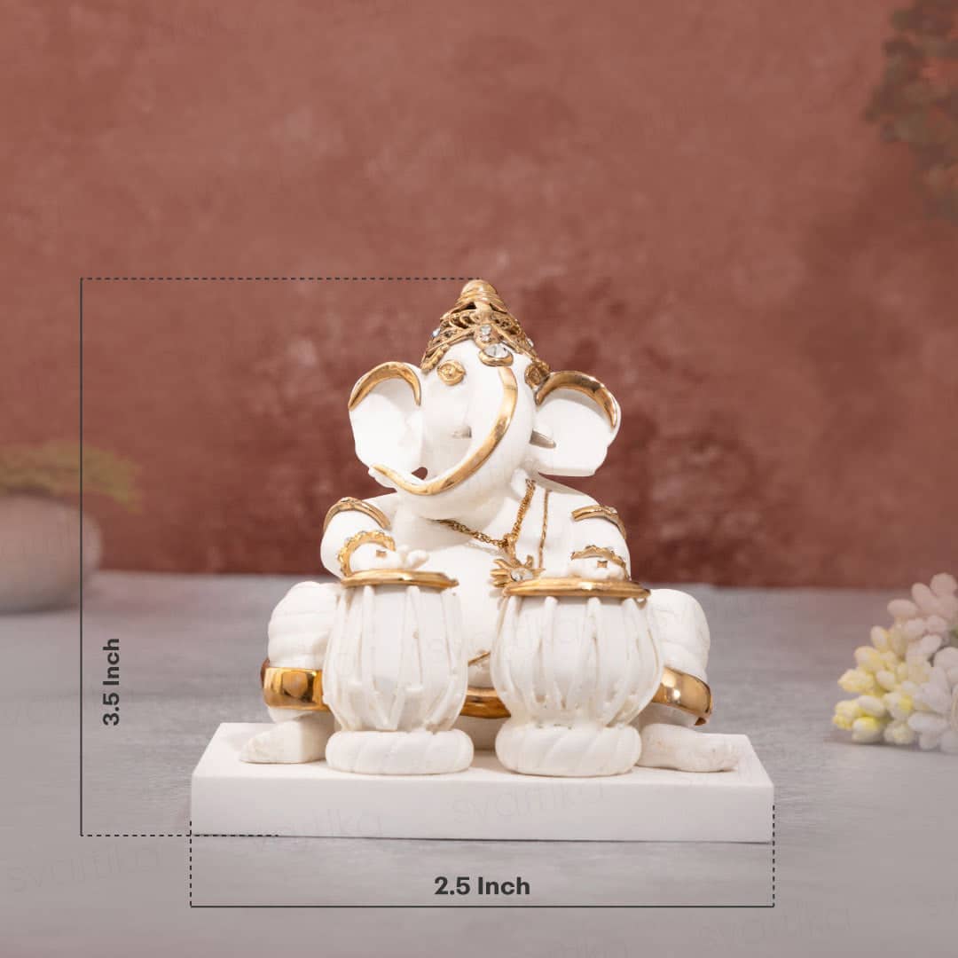 Celebrate divine harmony with our 4-inch Divine White Ganesha Idol (Playing Tabla), an exquisite Vinayaka idol crafted from marble dust with 24K gold plating. This Lord Ganesha murti, depicting the deity joyfully playing tabla, serves as a perfect Ganesh idol for a pooja room or office desk. As a unique Ganesha idol for car dashboard or a Vinayaka statue for home , it infuses spaces with positive energy. The intricate gold-plated details make this Ganesh Statue an ideal Ganpati idol for gift-giving, suitable for corporate gifts, housewarming return gifts, or wedding return gifts. This Ganesh ji idol , with its musical theme, is perfect for Ganesh Chaturthi idols or as a year-round Ganesh puja murti . Its small size makes it a versatile Ganesha idol small enough for various settings. Specially designed for auspicious occasions like Diwali, Navratri, and Lakshmi Pooja, this Vighnaharta Ganesh murti radiates festive cheer and divine blessings. Whether placed during Ganesh Sthapana or used as a decorative piece for Gajanana festivals, it enhances the sacredness of any space. Embrace divine joy with this masterpiece, combining spiritual significance with artistic beauty. Let this Vinayaka idol bring blessings, prosperity, and the essence of celestial music to your sacred or professional space.
