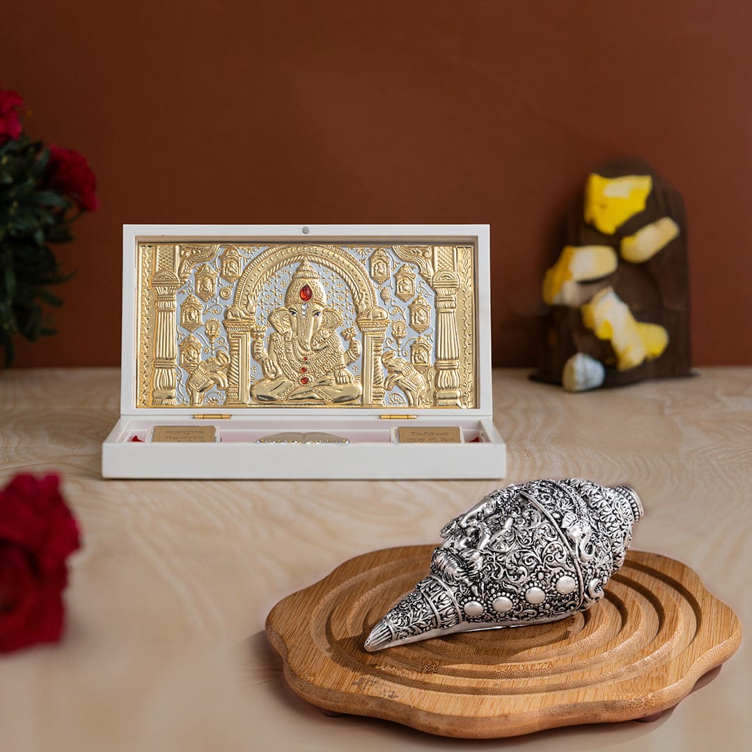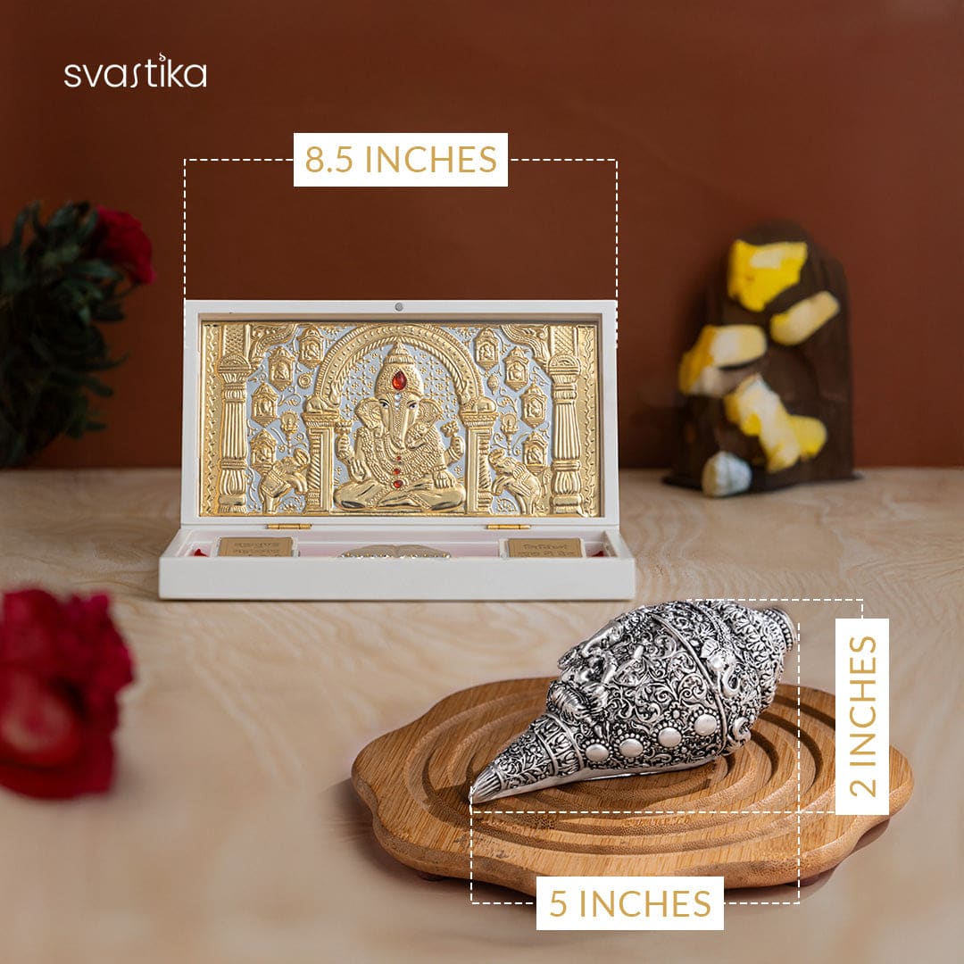 Ganesh Shankh (Conch) – Silver Plated (5 Inch) with Ganesha Pocket Temple – Gold Plated (Small) – Combo