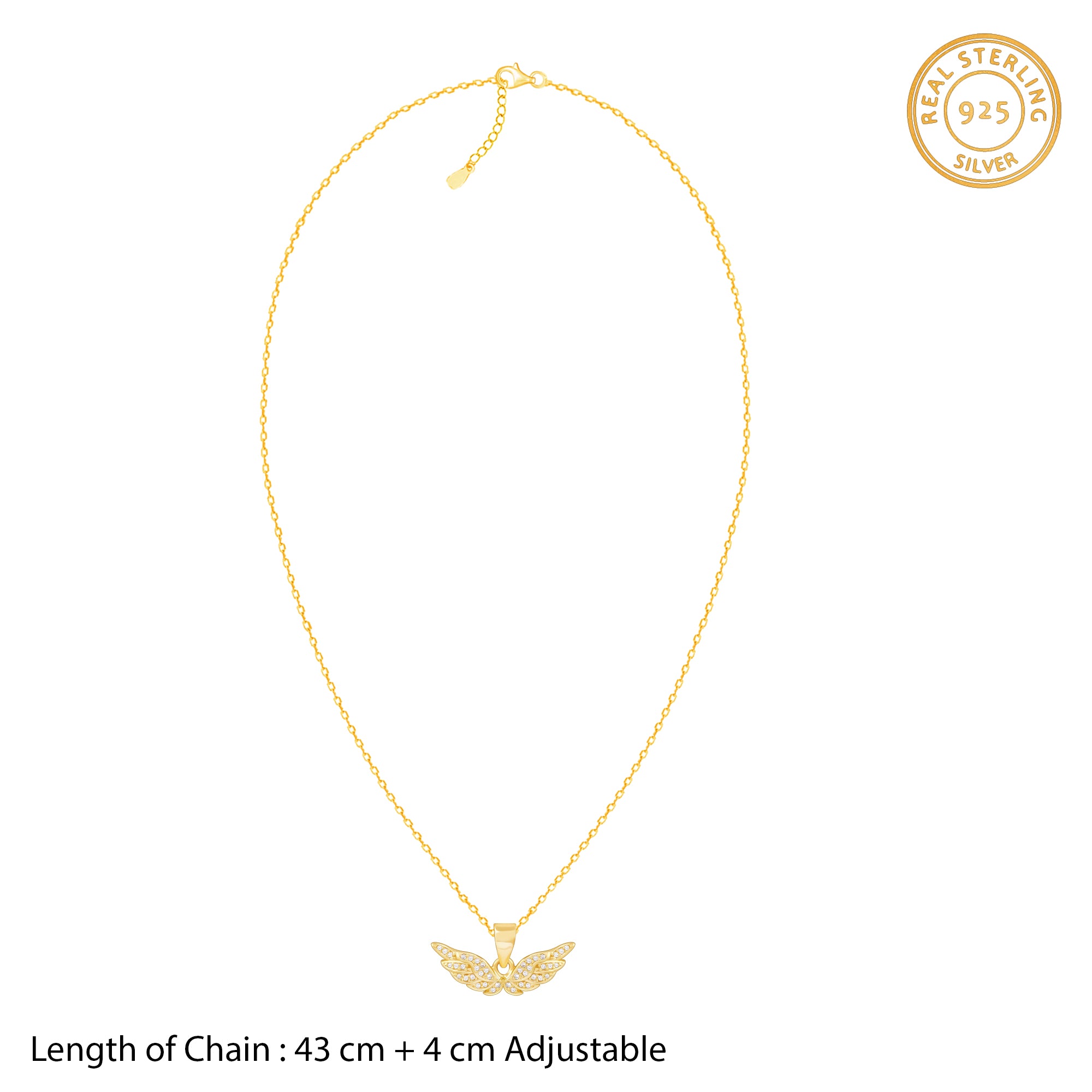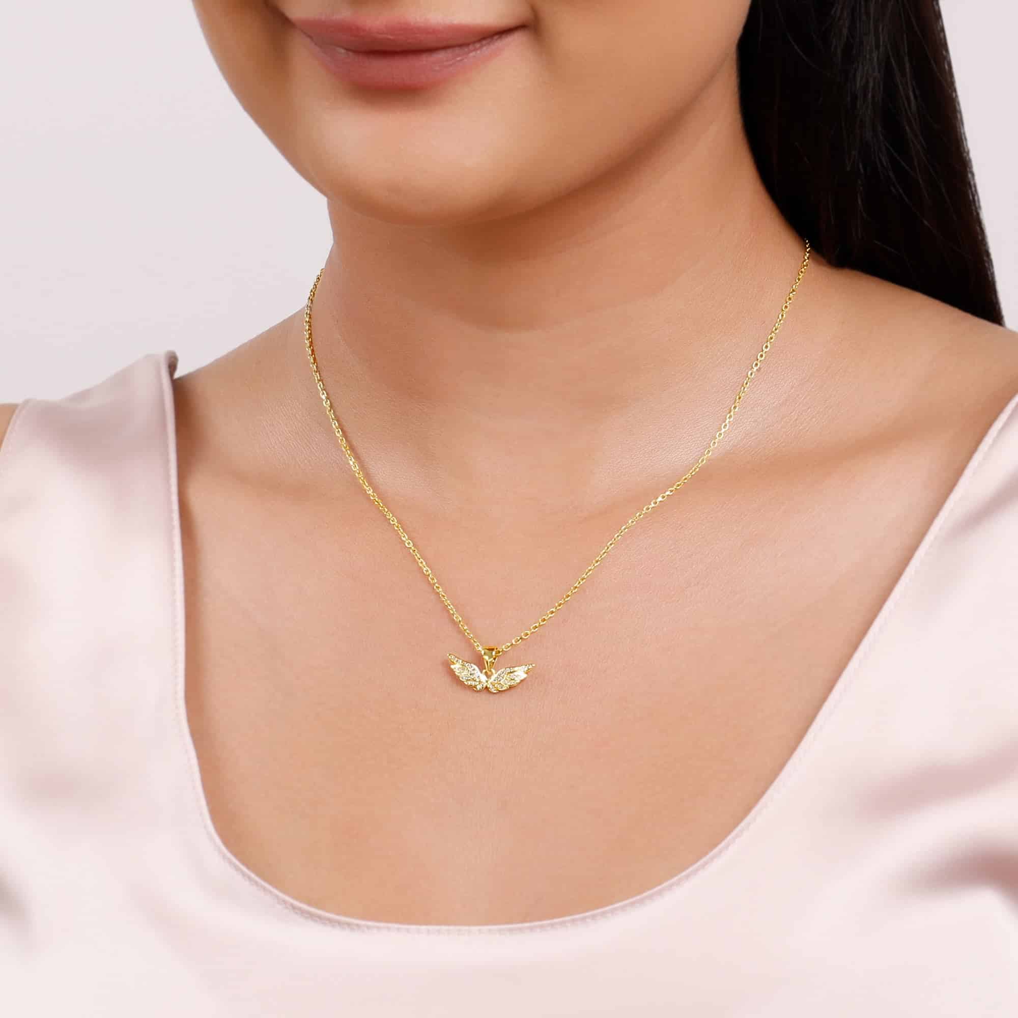 The Inspiration: Not too extra, not too plain, just the perfect dose of drama. One sway and you’re instantly the star of your own reel. The Design: This golden pendant for women has a wing charm in a gorgeous golden finish and it is studded with zircons. 925 Silver With Gold Plated Perfect for sensitive skin Motif Height: 1 cm, Motif Width: 2.1 cm Length of Chain: 43 cm + 4 cm Adjustable Comes with the Nikrish Jewellery kit and authenticity certificate Content: Pendant With Link Chain Net Qty- 1 unit Styling Tip: Style it with a white oversized shirt and skinny fit denims with a messy low bun.