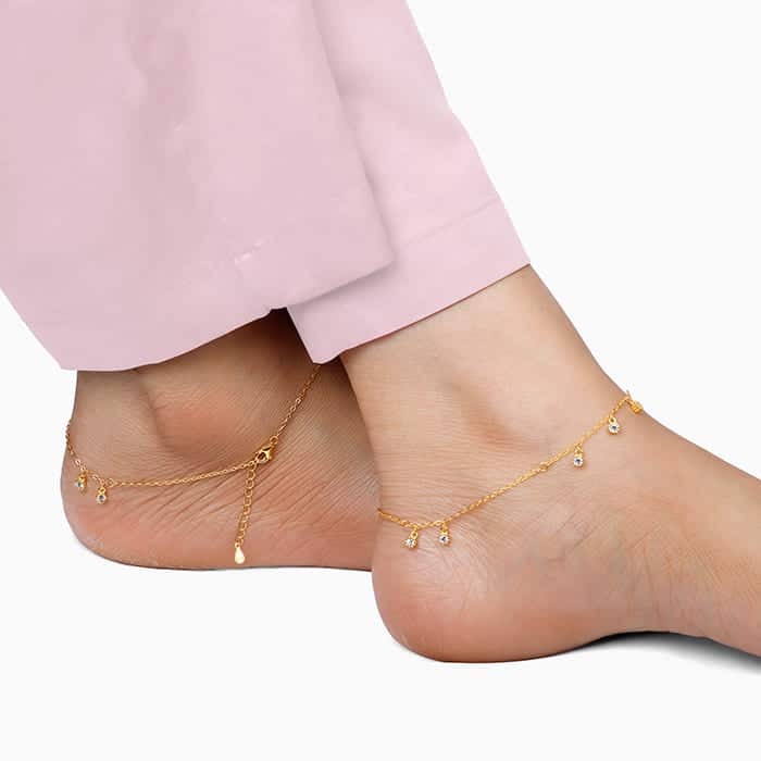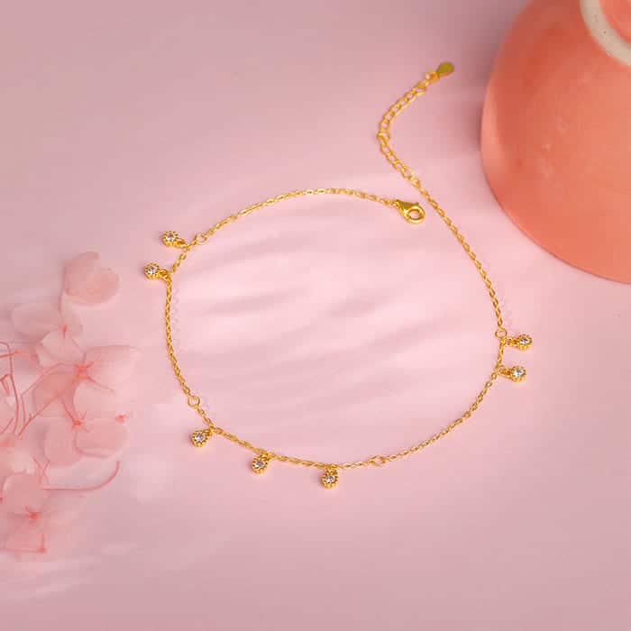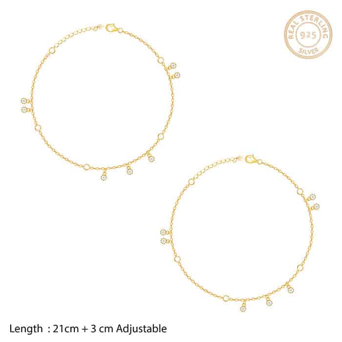 The Inspiration: The Golden Captivating Anklet is inspired by the crackling sound that comes from freshly baked bread. The Design: The golden anklet has a small charm that has zircons on them placed around the band. 925 Silver with Gold Plating AAA+ Quality Zircons Length of the anklets are 21 cm with 3 cm adjustable Comes with the Nikrish Jewellery kit and authenticity certificate Net Qty- 1 pair Styling Tip: Wear a white pleated midi skirt and a pink top.