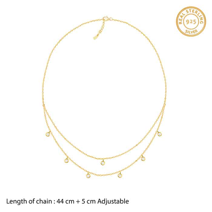 The Inspiration: Add an extra layer of charm to your look with this necklace. You don’t want to miss out on all season’s hottest, trends-layers! The Design: This golden necklace features a dual-layer chain with dangling circle charms, each nestling a zircon. 925 Silver with Gold Plating Perfect for sensitive skin Length of Chain: 44 cm + 5 cm Adjustable Comes with the Nikrish Jewellery kit and authenticity certificate Content: Necklace Net Qty- 1 unit Styling Tip: Style this with a baby pink dress.