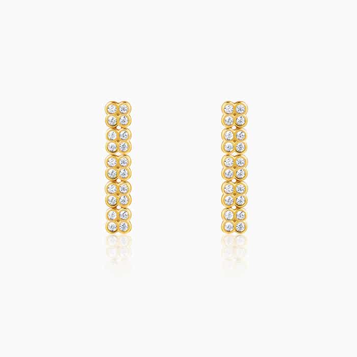 The Inspiration: This isn’t merely jewellery; it’s a statement of absolute conviction. Choose silver to powerfully express your inherent regality. The Design: These gold plated earrings for women feature four round zircons arranged in flower-like clusters. The clusters are stacked vertically in a sleek golden frame. Presenting our DIVA Collection – a limited edition silver jewellery meant for the women who own every room. Be the star of the party, always. 925 Silver with Gold Plating Perfect for sensitive skin Earring Size: Height – 2.6 cm, Width – 0.5 cm Comes with the Nikrish Jewellery kit and authenticity certificate Content: Earrings Net Qty- 1 pair Styling Tip: Wear these with a matching bracelet.
