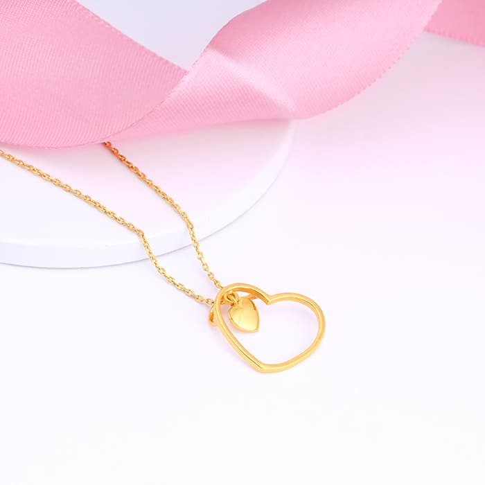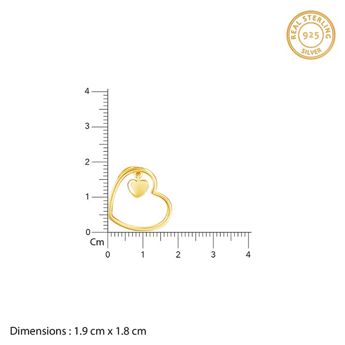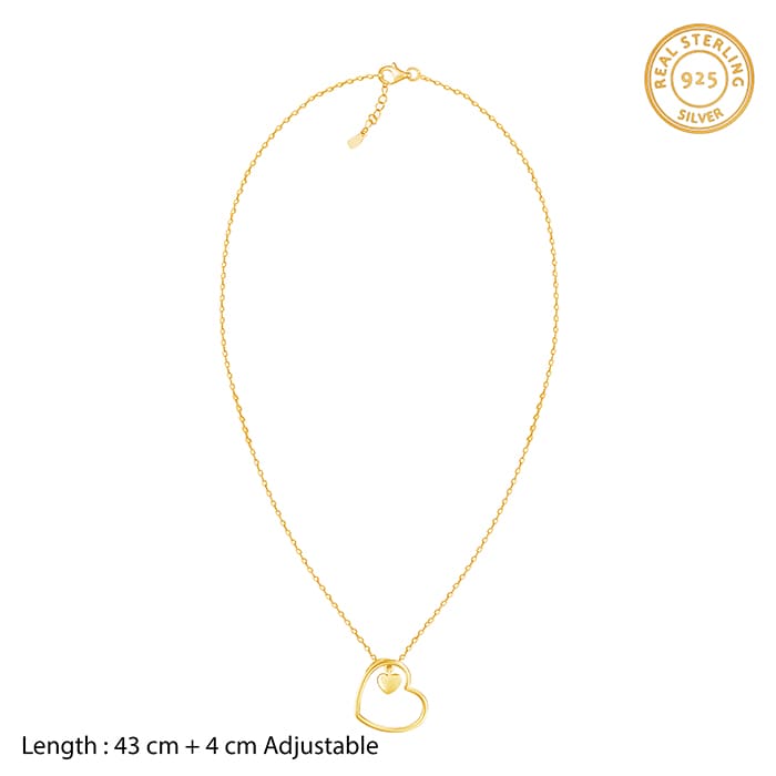 The Golden Heart Pendant With Link Chain is inspired by the immaculate idea of self-love, reminiscent of the tranquil waters allowing you to heal and feel bliss. The Design: The gold pendant has a diagonal heart charm encircling a smaller heart swaying and swirling. 925 Silver with Rose Gold Plating Perfect for sensitive skin The pendant size is 43 cm and the adjustable chain is 4 cm Motif Height: 1.9 cm, Width: 1.8 cm Comes with the Nikrish Jewellery kit and authenticity certificate Content:Â Necklace Net Qty- 1 unit Styling Tip: Style it with a black button-down shirt and grey denim.