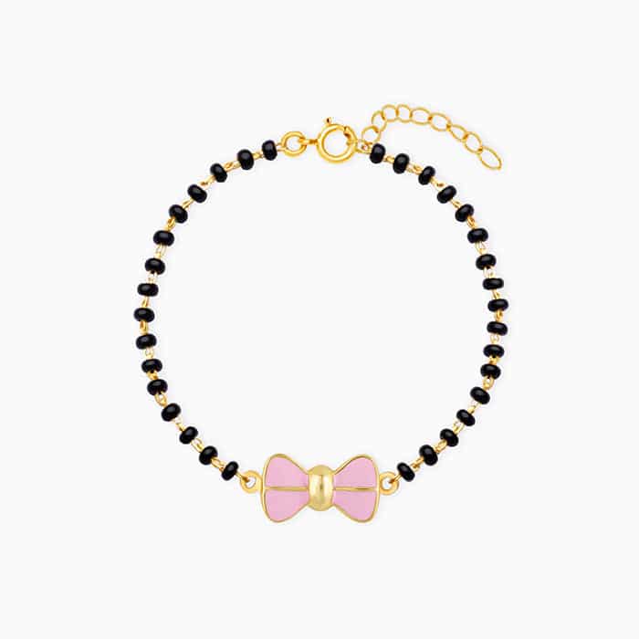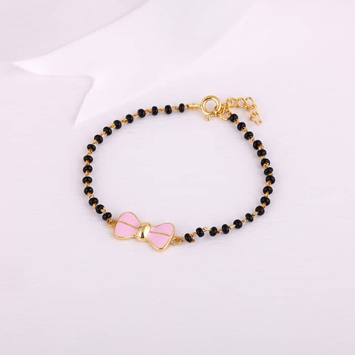 The Inspiration: The Golden Pink Bow Infant Bracelet is inspired by cute bow hair clips we see little girls wearing. They look so adorable! The Design: The golden infant bracelet has a cute pink bow with details in between in gold colour. 925 Silver Dimensions: 0.8 cm x 1.86 cm Length of the bracelet is 13.5 cm with 2.5 cm adjustable chain Comes with the Nikrish Jewellery kit and authenticity certificate Net Qty- 1Â piece Kids Friendly: Hypoallergenic (Skin-friendly) Comfortable to wear Cute designs Suitable for kids aged 0 – 18 Months