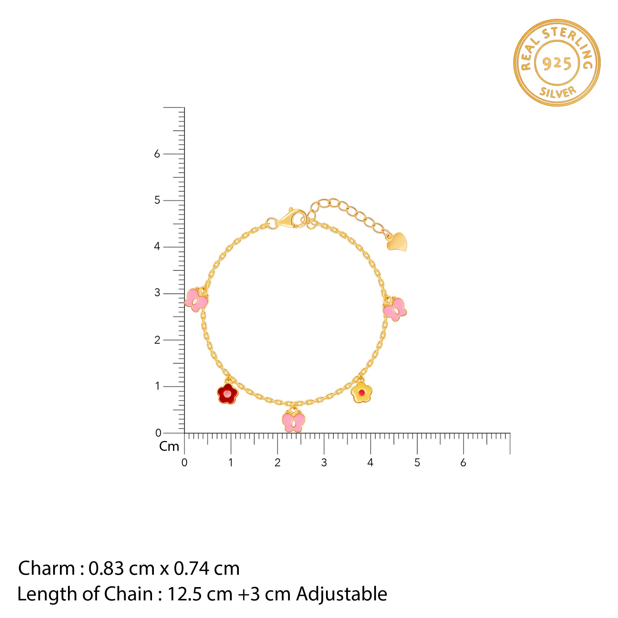 The Inspiration: Blooming with colour and cheer. This bracelet is made for the little one who brings springtime wherever she goes. The Design: This gold plated kids bracelet features flower and butterfly motifs with colourful enamel. 925 Silver with Gold Plating Perfect for kids’ sensitive skin Motif Size: Height – 0.83 cm, Motif Width – 0.74 cm Length of Chain: 12.5 cm + 3 cm Adjustable Comes with the Nikrish Jewellery kit and authenticity certificate Content:Â Bracelet Net Qty- 1Â unit Suitable for kids aged 2 – 8 Years Styling Tip: Pair this with nature-inspired studs.