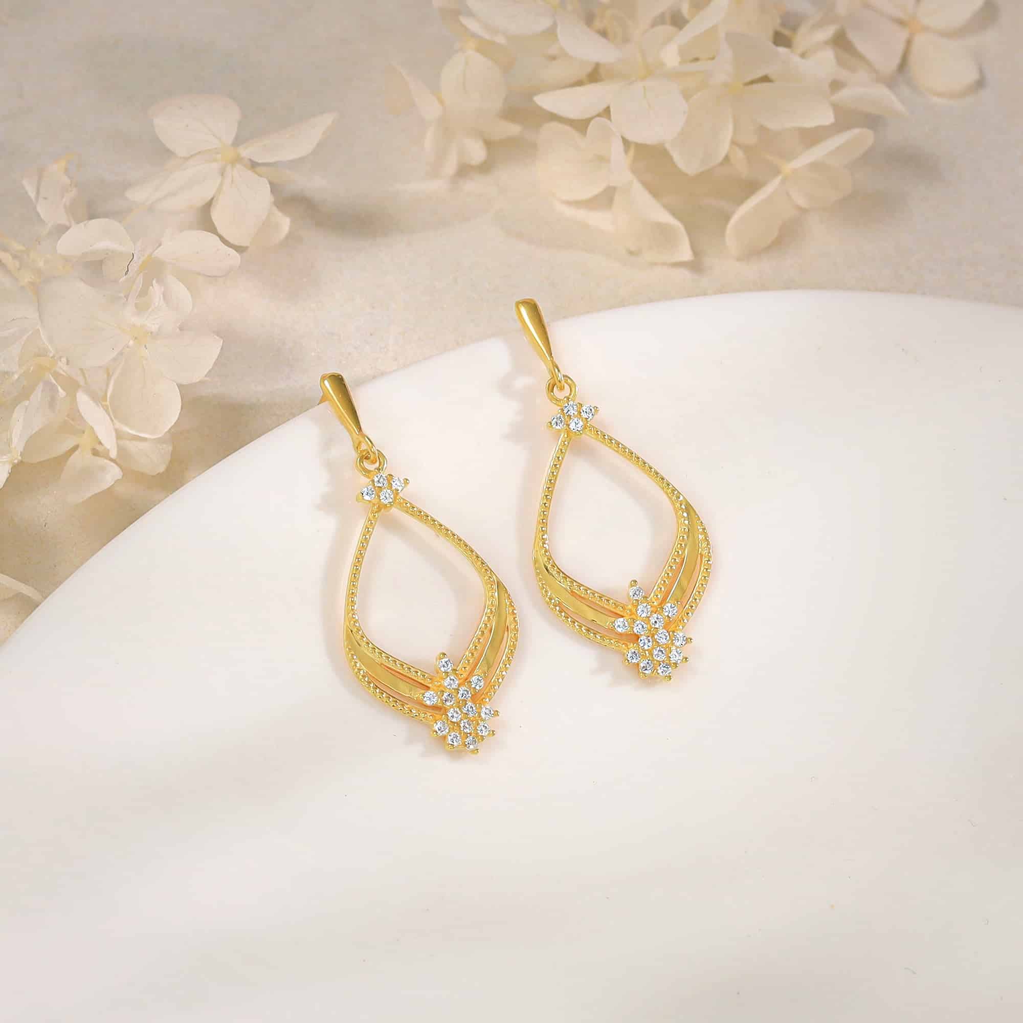 The Inspiration: The Golden Princess Earrings are inspired by the one who knows her time to shine has come. The Design: These earrings have an eye-catching elongated hoop with a cluster of zircons on the top and the bottom tip. 925 Silver with Gold Plating Perfect for sensitive skin Size: Height – 3.6 cm, Width – 1.6 cm Comes with the Nikrish Jewellery kit and authenticity certificate Content: Earrings Net Qty- 1 pair Styling Tip: Style these earrings with a maroon A-line dress.