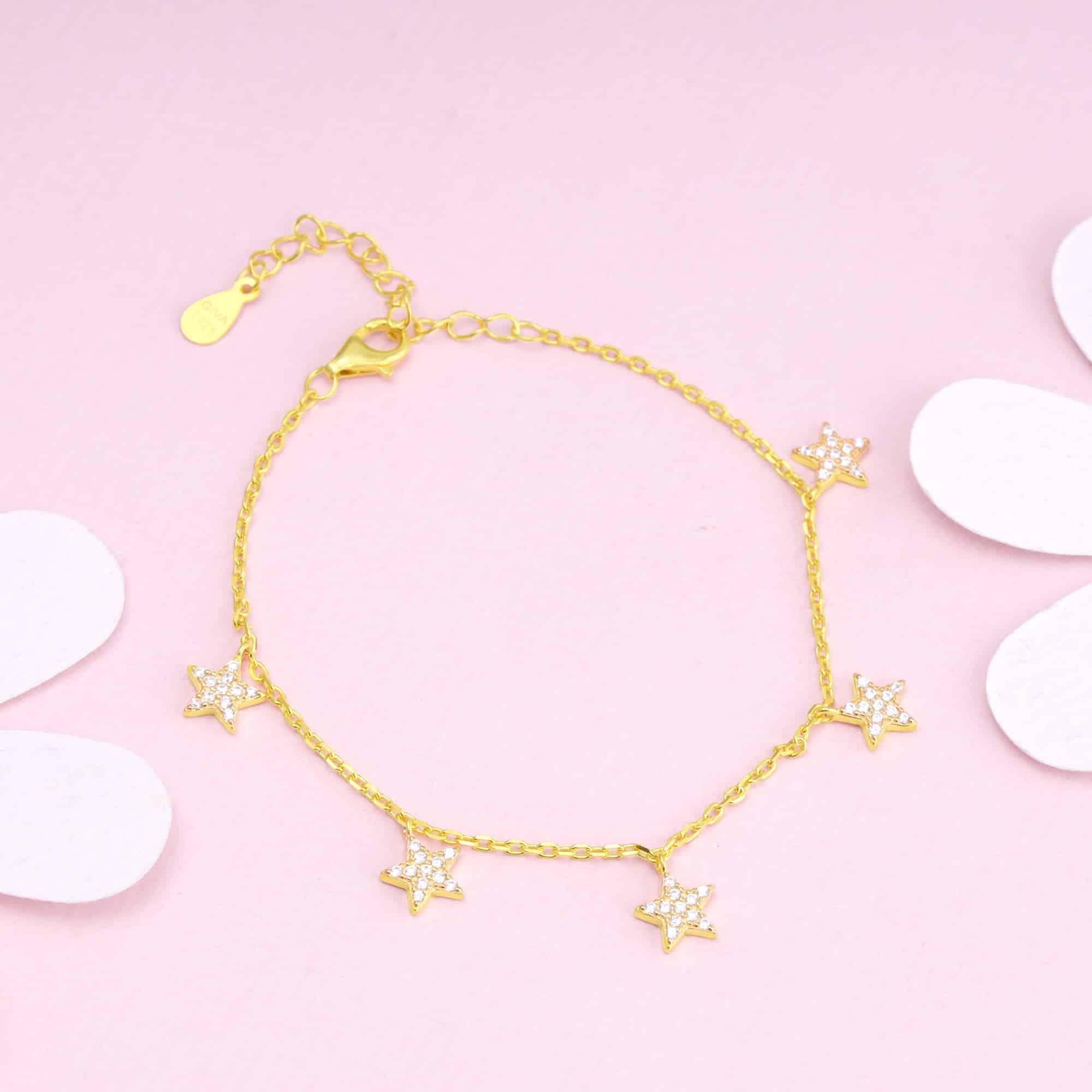 The Inspiration: The Golden Star Constellation Bracelet is inspired by the moonless night sprinkled with the white glitters of stars. The Design: This golden bracelet has five petite zircon-studded stars. 925 Silver with Gold plating AAA+ Quality Zircons The length of the bracelet is 15 cm with a 6 cm adjustable portion Charm Dimensions: 0.8cm x 0.6 cm Hypoallergenic – Perfect for sensitive skin Comes with the Nikrish Jewellery kit and authenticity certificate Net Qty- 1 piece Styling Tip: Style this bracelet with a neck tie up dress.