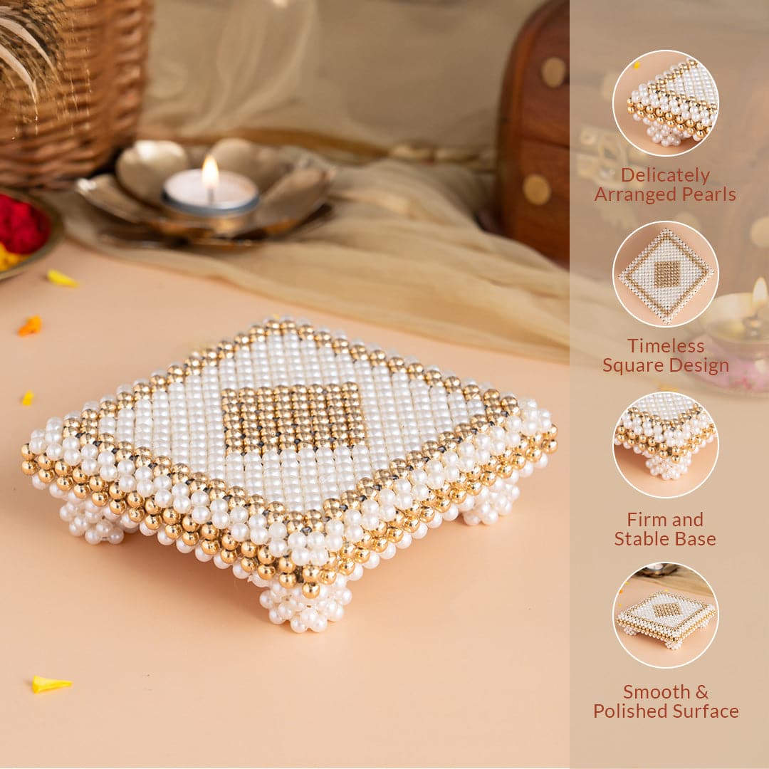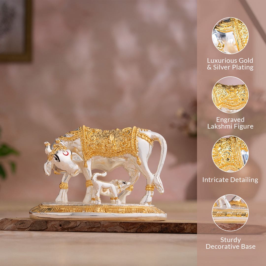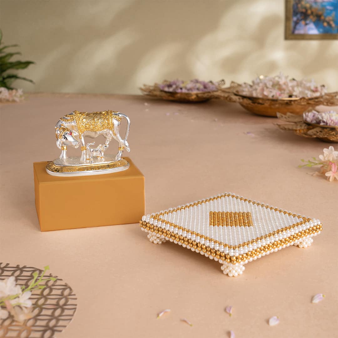 Kamdhenu Cow with Calf Idol – Gold & Silver Plated (3.5 Inch) with White & Gold Pearl Pooja Chowki (7 Inch) – Combo