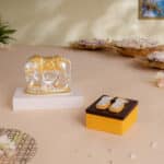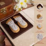 Invite divine abundance and spiritual harmony into your home with this auspicious combo featuring a Kamdhenu Cow with Calf Idol (5 inch) and Maa Lakshmi’s Charan Paduka placed on a beautifully crafted base both in radiant gold and silver plating . The Kamdhenu Cow with Calf represents purity, nurturing energy, and wish-fulfilling blessings in Hindu tradition. Revered as a divine source of wealth and spiritual strength, this intricately crafted 5-inch idol makes a graceful addition to your pooja space or altar. Complementing it is Maa Lakshmi’s Charan Paduka on an Elegant Base , symbolizing the sacred footsteps of the Goddess of Wealth. Placing her Charan in your home or office is believed to attract prosperity, success, and divine positivity. Together, they form a powerful spiritual decor combo , ideal for daily worship, festival decor, or as a meaningful gift for Diwali, weddings, housewarming ceremonies, and corporate gifting. Kamdhenu Cow with Calf Idol: 5 inches (Gold & Silver Plated) Lakshmi Charan Paduka: Gold & Silver Plated with Elegant Base Ideal For: Pooja room decor, vastu setup, festive gifting, return gifts, and divine blessings for home or office.