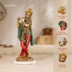 Dive into the divine presence of Lord Krishna with this exquisite 10-inch standing Krishna statue . Masterfully sculpted from polyresin and adorned with an antique/metal finish , it captures the beloved kanha ji in his eternal form, playing the enchanting melodies of his flute. The intricate details, from the vibrant red and green hues of his clothing to the joyous expression on his face, transport you to the whimsical realms of Gopal in Gokul & Vrindavan. More than just an artistic masterpiece, this Standing Krishna statue radiates an aura of spiritual bliss and childlike wonder. Whether gracing your Pooja room, office space, or gifted to commemorate auspicious occasions like Janmashtami, weddings, or housewarming ceremonies , it promises to elevate your surroundings with its captivating artistry and divine energy.