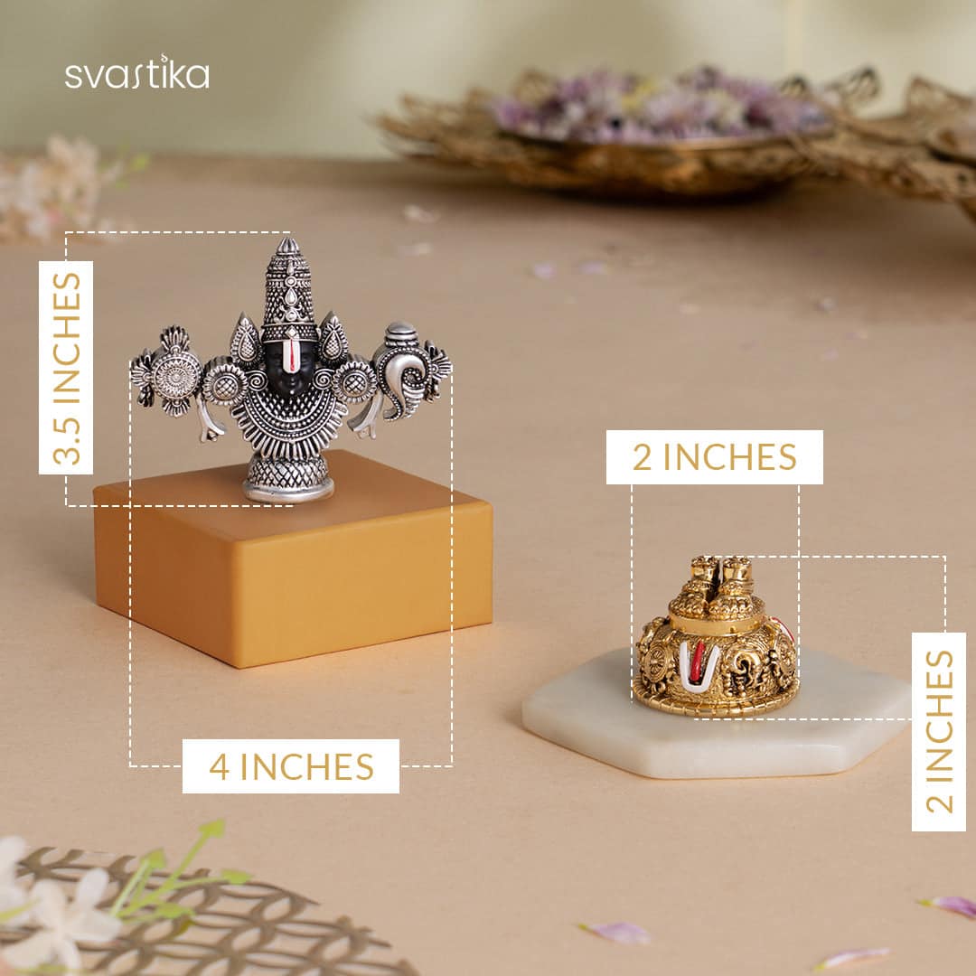 Experience the divine aura of Lord Venkateswara with this powerful spiritual combo featuring a Lord Balaji Face Idol (4 inch, silver plated) and a Balaji Charan with Shanku Chakra Namam (2 inch, gold plated). The Balaji Face Idol , crafted in elegant silver plating, radiates grace, devotion, and spiritual strength. Known as the Lord of Wealth and Protection, Balaji is worshipped for fulfilling desires and removing obstacles. This intricately designed face idol brings the sacred presence of Tirupati Balaji into your home temple or workspace. Paired with the Balaji Charan , featuring the symbolic Shanku (conch), Chakra (discus), and Namam (tilak) , this 2-inch gold-plated piece represents the divine footprint of the Lord. Placing it in your home is believed to attract blessings, prosperity, and peace. Together, this combo makes a perfect devotional gift set for daily pooja, Tirupati return gifts, housewarmings, or festive gifting . Lord Balaji Face Idol: 4 inches (Silver Plated) Balaji Charan with Shanku Chakra Namam: 2 inches (Gold Plated) Ideal For: Home temple, pooja rituals, spiritual gifting, Tirupati darshan mementos, Diwali décor, and devotional offerings.