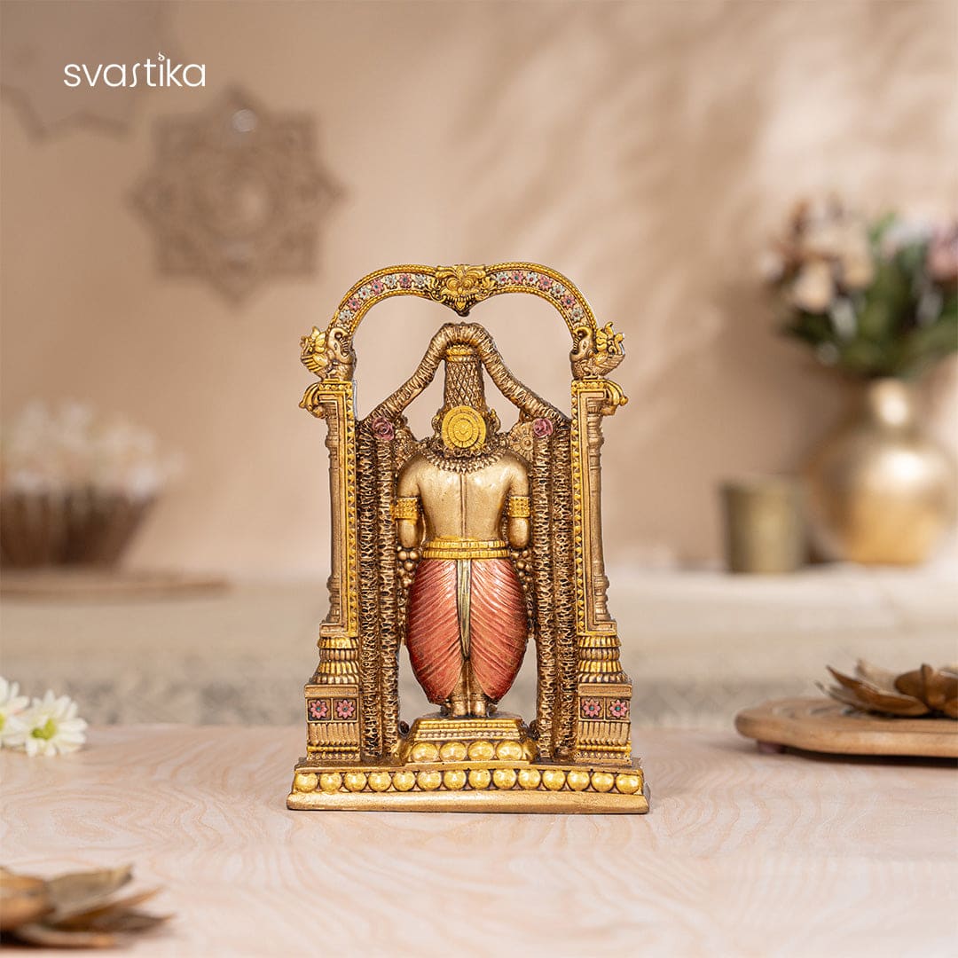 Transform your sacred space with the timeless beauty of the Lord Tirupati Balaji (Venkateswara) idol, now available in a stunning antique finish. This 8-inch masterpiece exudes divine energy and classic elegance, making it a perfect addition to your spiritual sanctuary. Intricate Depiction of Divine Grace This intricately crafted idol features Lord Venkateswara standing tall, his four arms holding the symbolic Sudarshana Chakra and Conch. The antique finish highlights the fine detailing of his ornate crown and jewelry, creating a sense of reverence and awe. Sacred Symbol of Protection and Devotion More than just a decorative piece, this Tirupati Balaji murti embodies the essence of Lord Venkateswara, revered as the preserver and protector of the universe. Placing this idol in your home or temple invites divine blessings, spiritual growth, and protection for your family and surroundings. Perfect for Your Pooja or Home Décor The antique finish lends a timeless charm to the idol, making it a versatile addition to your pooja room or as an elegant decorative centerpiece. Its presence infuses any space with a sacred and serene ambiance. Meaningful Gift for Devotees This Lord Venkateswara statue is an ideal gift for occasions like housewarmings, weddings, or festivals. Share the blessings and divine energy of Tirupati Balaji with your loved ones through this spiritually significant offering. Infuse your surroundings with the eternal grace and protective energy of Lord Tirupati Balaji. This antique-finish idol is not only a spiritual symbol but also a timeless work of art that inspires devotion and peace.