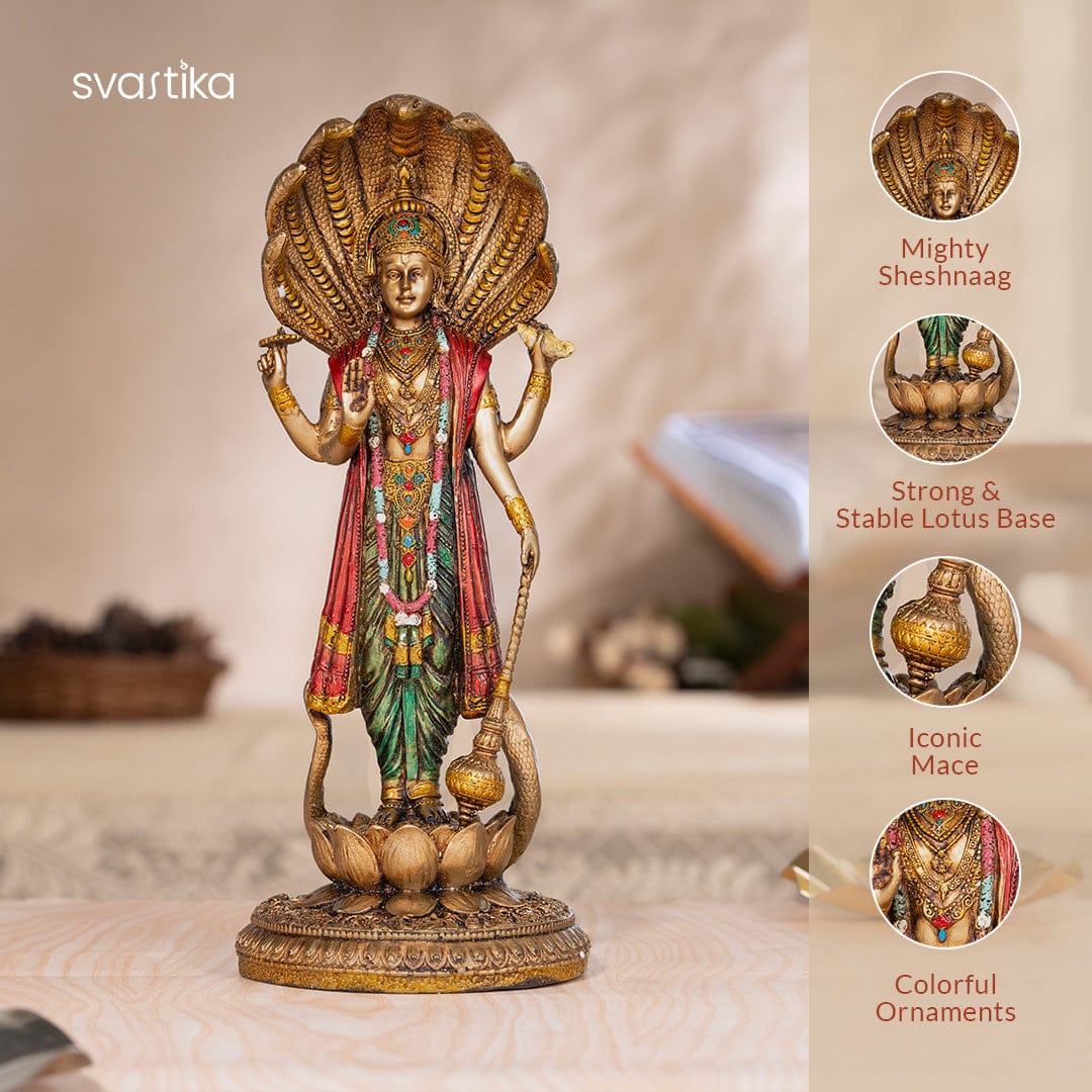 Bring home divine blessings with this Antique Vishnu and Lakshmi Murti Combo Pack , a symbol of prosperity, protection, and harmony. This exquisite combo includes: 🔹 Lord Vishnu Murti (12 inches): A finely detailed brass idol depicting Lord Vishnu in his Ananta Shesha avatar , representing cosmic balance and eternal preservation. His poised stance and intricate embellishments make this idol a timeless piece for devotion and decor. 🔹 Goddess Lakshmi Murti (10 inches): Crafted in rich antique finish, this idol of Maa Lakshmi , the Goddess of wealth and prosperity, radiates divine elegance. With intricate ornaments and a serene expression, this statue is a perfect addition to your pooja room or festive decor. This auspicious combo set is ideal for Diwali, housewarming, weddings, and spiritual gifting , inviting abundance, peace, and positivity into your home.