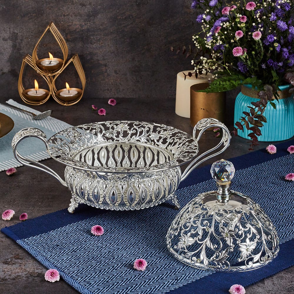 Exquisite 8.5-Inch Decorative Metal Dry Fruit Bowl with Lid Enhance your home decor with our elegantly designed 8.5-inch decorative metal dry fruit bowl with a lid. This stunning piece combines artistry and practicality, making it a versatile addition to your living space while exuding a refined charm. Larger Size for Elevated Elegance At 8.5 inches, this bowl offers a generous size that stands out from standard serving bowls, allowing you to display an ample selection of dry fruits or treats in an appealing arrangement. Its substantial design makes it perfect for both casual gatherings and festive occasions. Sophistication in Every Detail Featuring a radiant silver finish, this decorative bowl seamlessly complements any modern or traditional decor. Its intricate detailing and polished surface add a touch of luxury, making it an eye-catching centerpiece for your dining table, coffee table, or kitchen counter. Functional Design with Lid for Freshness The included lid not only enhances the bowl’s aesthetic appeal but also ensures that your dry fruits stay fresh and protected. This practical addition allows you to serve and store your snacks with style while preserving their flavor and aroma. Perfect Blend of Style and Utility Crafted with precision and durability, this 8.5-inch dry fruit bowl is as functional as it is beautiful. Its versatile design makes it a thoughtful gift for housewarming events, weddings, or special celebrations. Infuse your home with elegance and practicality with this decorative metal dry fruit bowl—a timeless piece that combines beauty and functionality to make every occasion extraordinary.