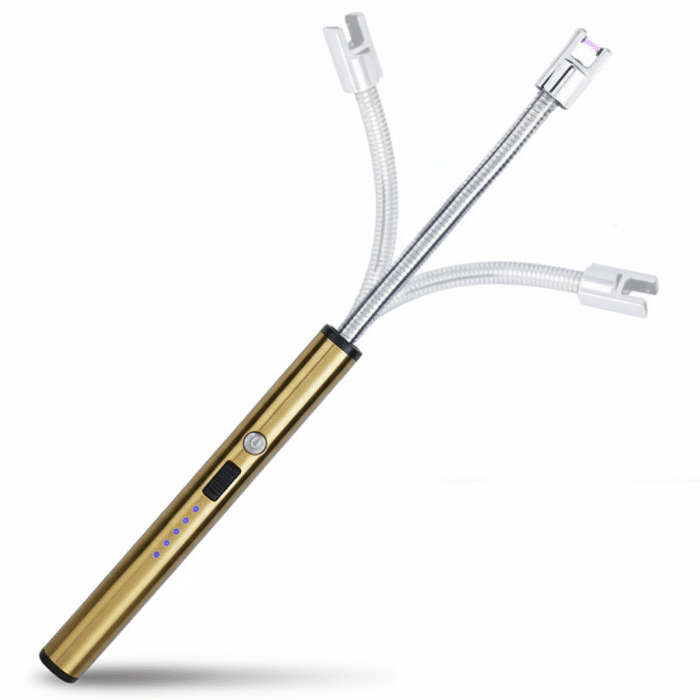 The Rechargeable Electric Arc Lighter is a modern, USB-rechargeable lighter featuring a 360° flexible aluminum neck designed to reach difficult spots easily. It ignites through a flameless plasma arc, making it windproof, clean, and safe for lighting candles, gas stoves, fireplaces, BBQs, incense, and more. The device includes an LED battery indicator, safety lock mechanism, and offers fast charging with the supplied USB cable. The construction is durable and eco-friendly, reducing the need for disposable gas lighters.