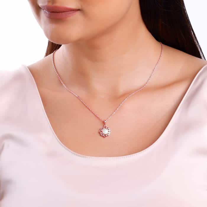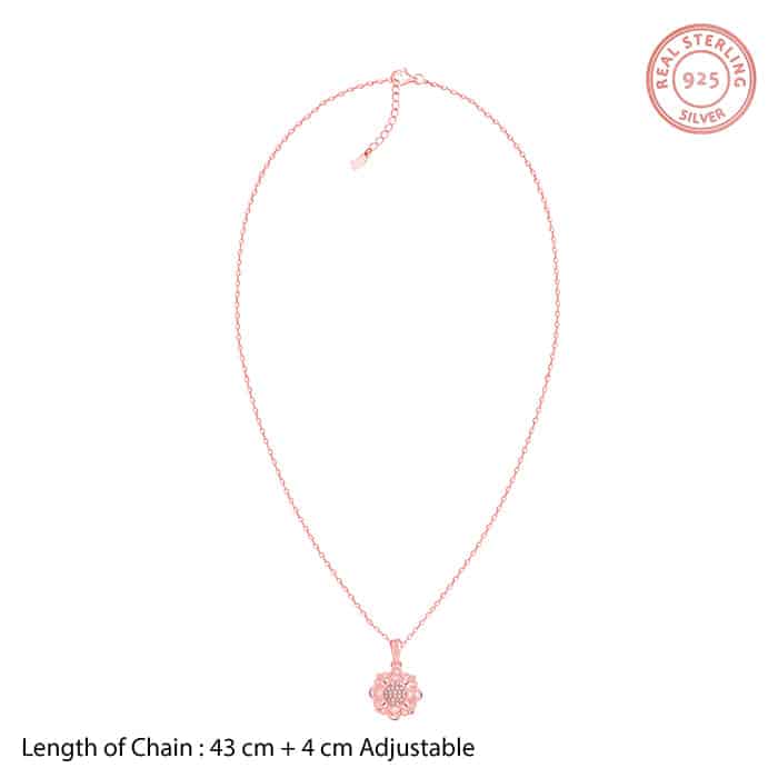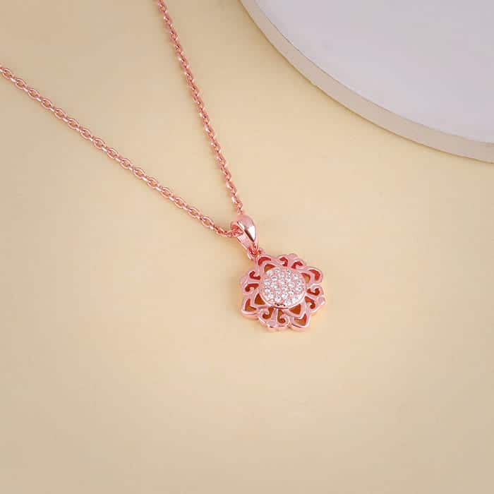 The Inspiration: This flower pendant adds grace without trying too hard. It’s the kind of sparkle that blends right in, but never goes unnoticed. The Design: This rose gold pendant for women features a unique flower design. The centre of the flower is studded with zircons. This pendant comes with a link chain. 925 Silver with Rose Gold Plating Perfect for sensitive skin Motif Height: 2 cm, Motif Width: 1.3 cm Length of Chain: 43 cm + 4 cm Adjustable Comes with the Nikrish Jewellery kit and authenticity certificate Content: Pendant with Link Chain Net Qty- 1 unit Styling Tip: Pair this with star earrings.