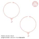 The Inspiration: Walk like you’re floating—this anklet brings a touch of magic with every twirl. The Design: This rose gold plated anklet for women features a beautiful butterfly motif with two dangling zircon stones. 925 Silver with Rose Gold Plating Perfect for sensitive skin Charm : 2.7 cm x 1.8 cm Length of the anklet: 25.5 cm + 4 cm Adjustable Comes with the Nikrish Jewellery kit and authenticity certificate Content: Anklet Net Qty- Single or pair, as chosen by you! Styling Tip: Team this with a denim dress with collared detail.