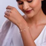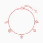 The Inspiration: Your wrist, your story. Fill it with charms that capture your unique moments and memories. The Design: This rose gold bracelet features five charms: a leaf, two butterflies, an owl, and a square motif, all studded with zircons. 925 Silver with Rose Gold Plating Perfect for sensitive skin Motif Height: 0.8 cm, Width: 3 cm Length of Chain: 15 cm + 4.5 cm Adjustable Comes with the Nikrish Jewellery kit and authenticity certificate Content: Bracelet Net Qty- 1 unit Styling Tip: Style this with a t-shirt dress.