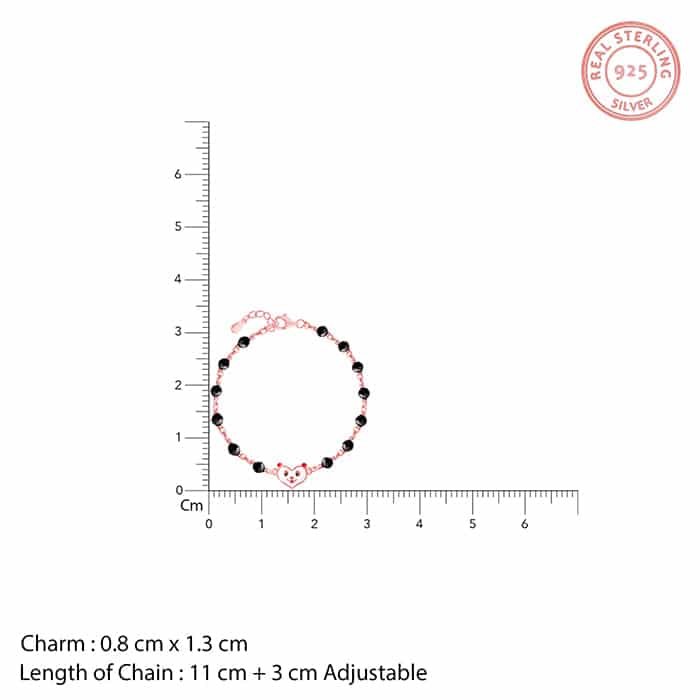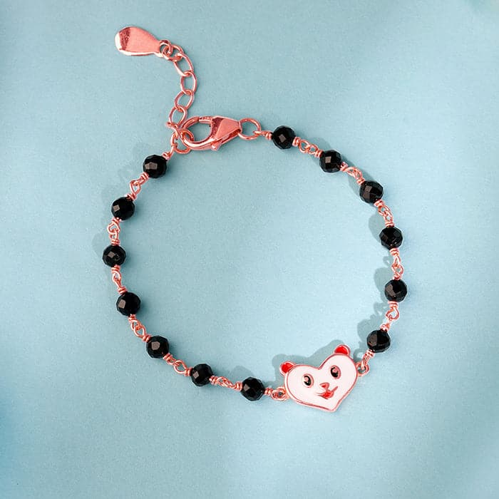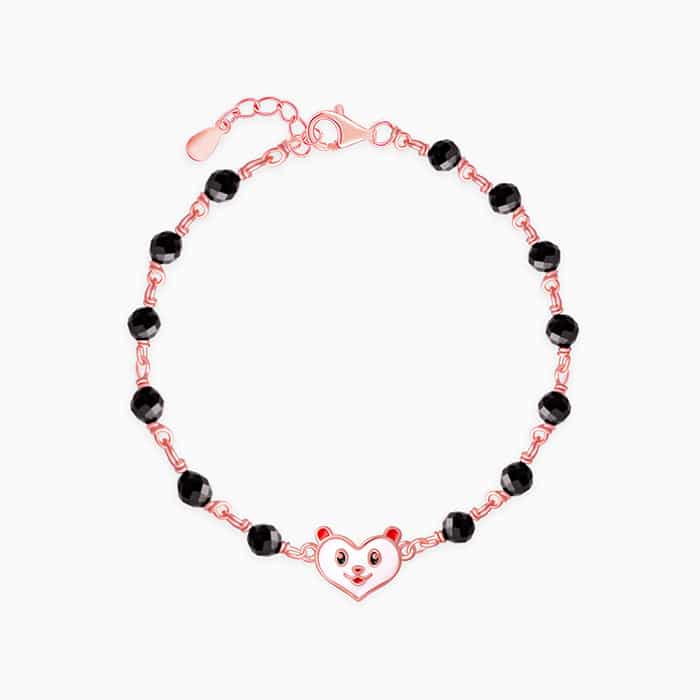 The Inspiration: Wrapped around her wrist like a tiny wish. This nazariya bracelet is made to watch over her world of giggles and dreams. The Design: This rose gold kids bracelet features a Nikrish mascot at the centre. The enamel-coated mascot pairs beautifully with black beads on the chain. 925 Silver with Rose Gold Plating Perfect for kids’ sensitive skin Charm: 0.8 cm x 1.3 cm Length of chain: 11 cm + 3 cm Adjustable Comes with the Nikrish Jewellery kit and authenticity certificate Content: Bracelet Net Qty- 1 unit Styling Tip: Pair this with your kid’s adorable outfit.