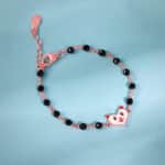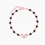 The Inspiration: Wrapped around her wrist like a tiny wish. This nazariya bracelet is made to watch over her world of giggles and dreams. The Design: This rose gold kids bracelet features a Nikrish mascot at the centre. The enamel-coated mascot pairs beautifully with black beads on the chain. 925 Silver with Rose Gold Plating Perfect for kids’ sensitive skin Charm: 0.8 cm x 1.3 cm Length of chain: 12 cm + 4 cm Adjustable Comes with the Nikrish Jewellery kit and authenticity certificate Content: Bracelet Net Qty- 1 unit Styling Tip: Pair this with your kid’s adorable outfit.