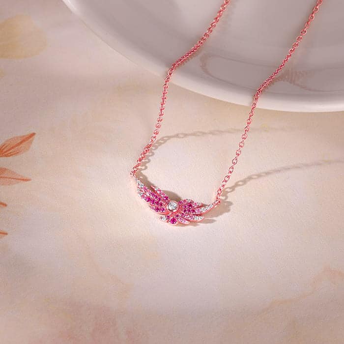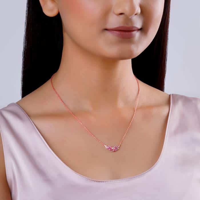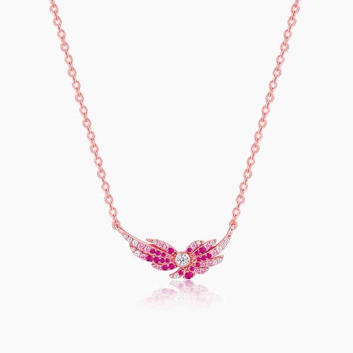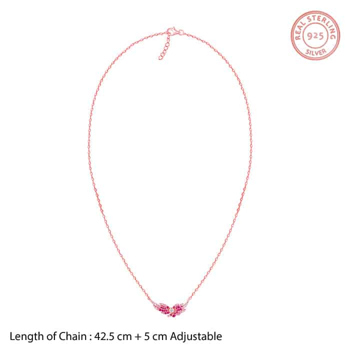 The Inspiration: It’s pretty and in pink! We think this bird-inspired wing necklace can be a wonderful addition to your collection. The Design: This rose gold necklace features a wing design with pink coloured stones in an ombre setting nestling a zircon in the centre. Nikrish celebrates the migratory birds that visit India during Summer through our latest colourful collection called Wings of Wonder. 925 Silver with Rose Gold Plating Perfect for sensitive skin Motif Size: Height – 1 cm, Width – 2.2 cm Length of chain: 42.5 cm + 5 cm Adjustable Comes with the Nikrish Jewellery kit and authenticity certificate Content: Necklace Net Qty- 1 unit Styling Tip: Style this with a scoop neck midi dress.