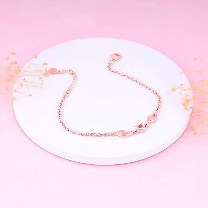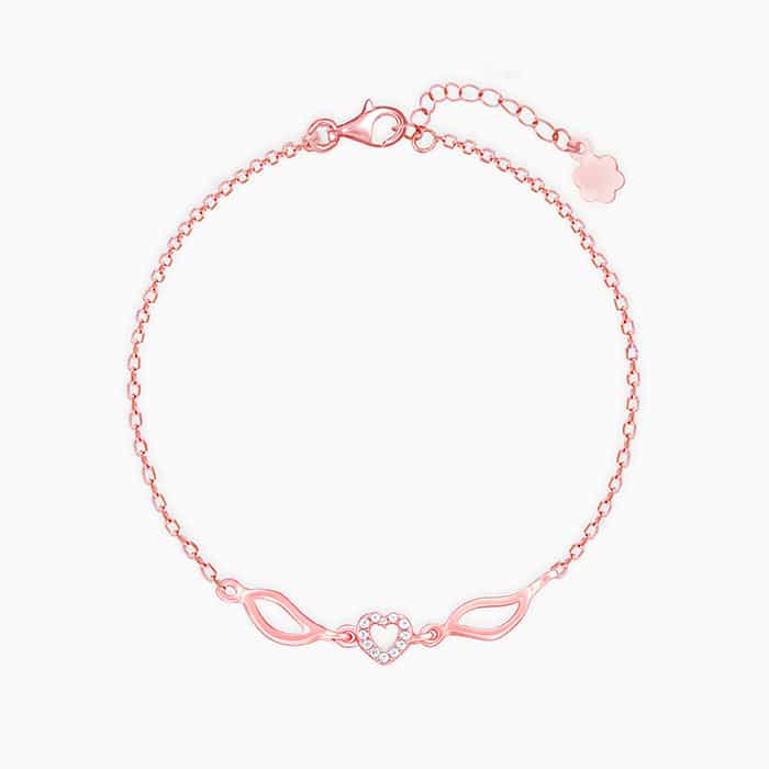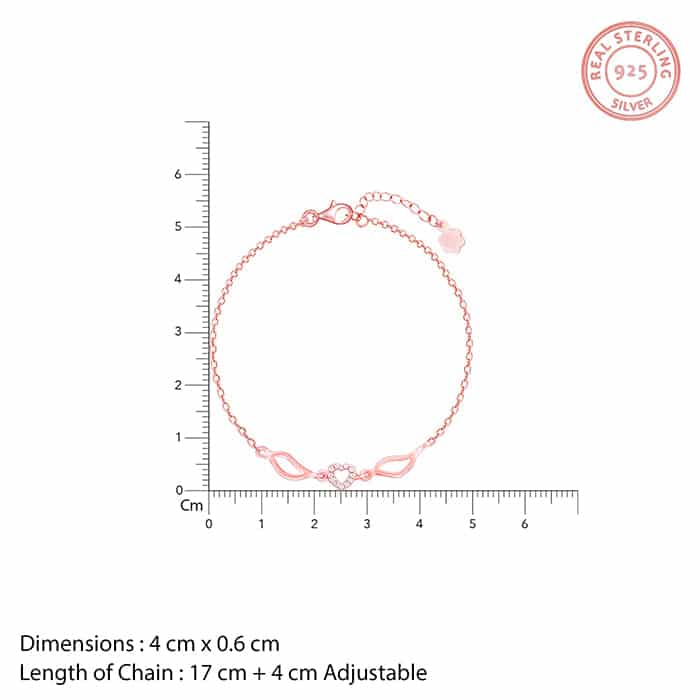 The Inspiration: Experience the embrace of love with the Rose Gold Love Affection Bracelet. This warm and radiant piece is all about enduring connections. The Design: This rose gold bracelet has a zircon studded heart motif in the centre and two leaves at either end. 925 Silver with Rose Gold Plating Perfect for sensitive skin Motif Height: 4 cm, Width: 0.6 cm Length of chain:Â 17 cm + 4 cm Adjustable Comes with the Nikrish Jewellery kit and authenticity certificate Content:Â Bracelet Net Qty- 1Â unit Styling Tip: Style this bracelet with a pink flared dress.