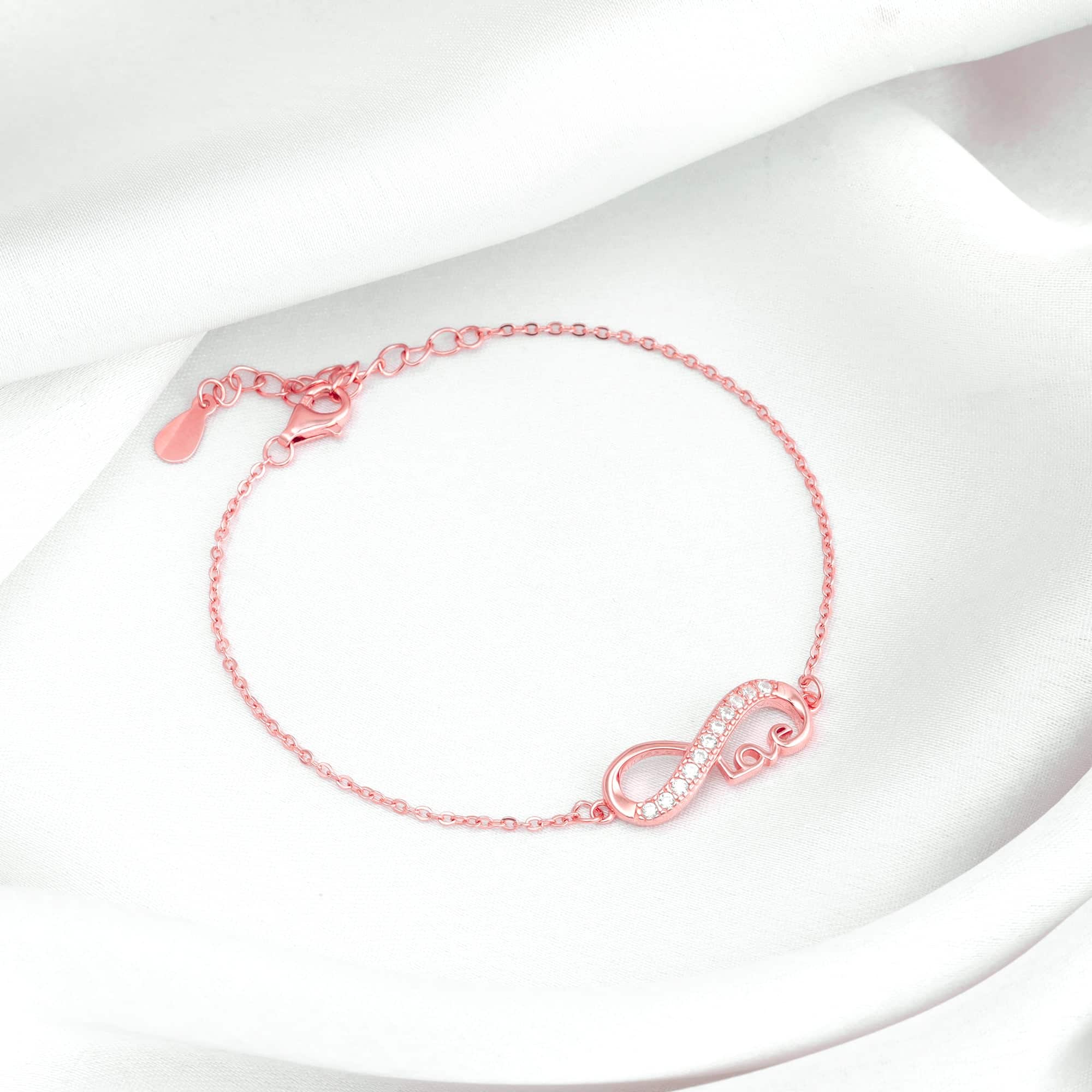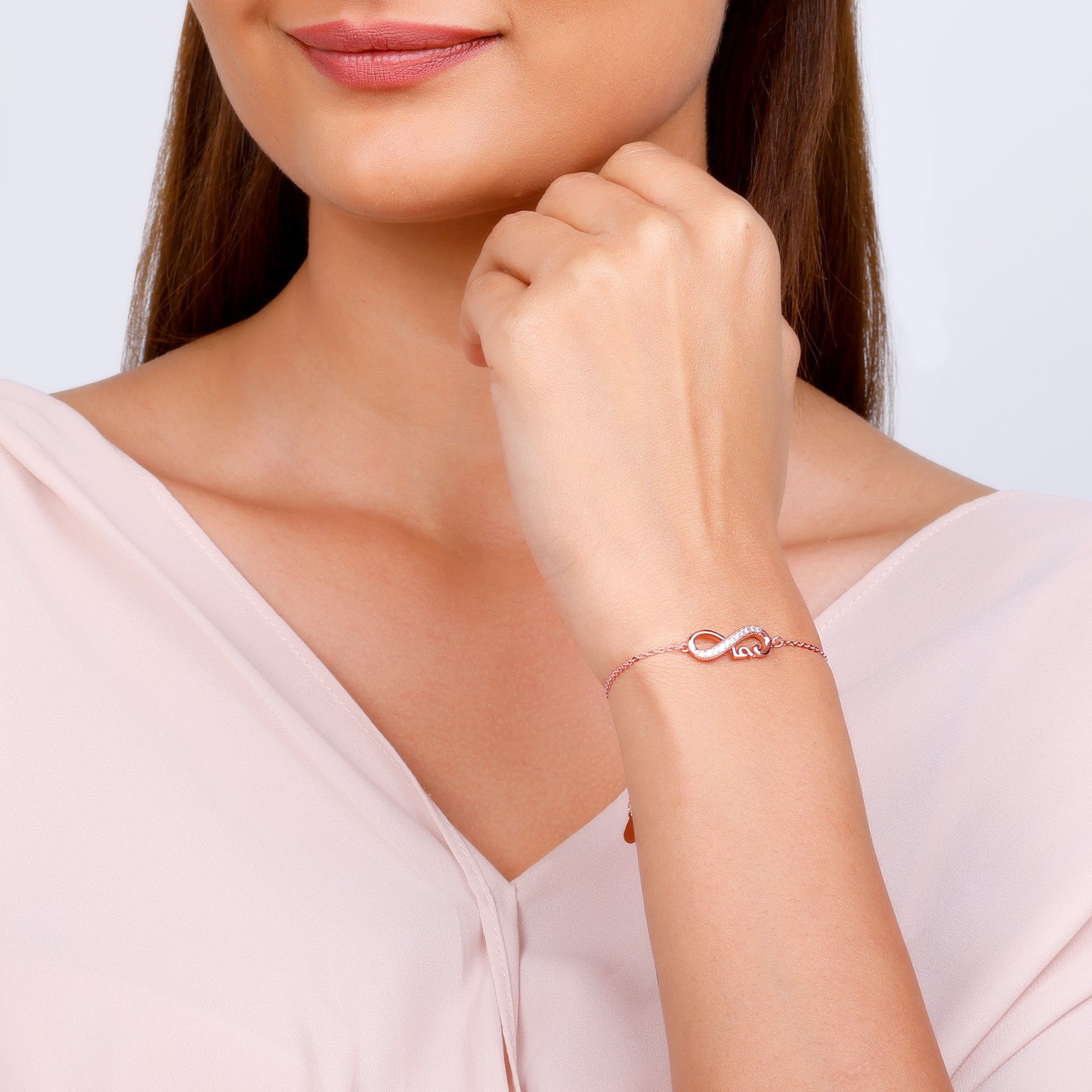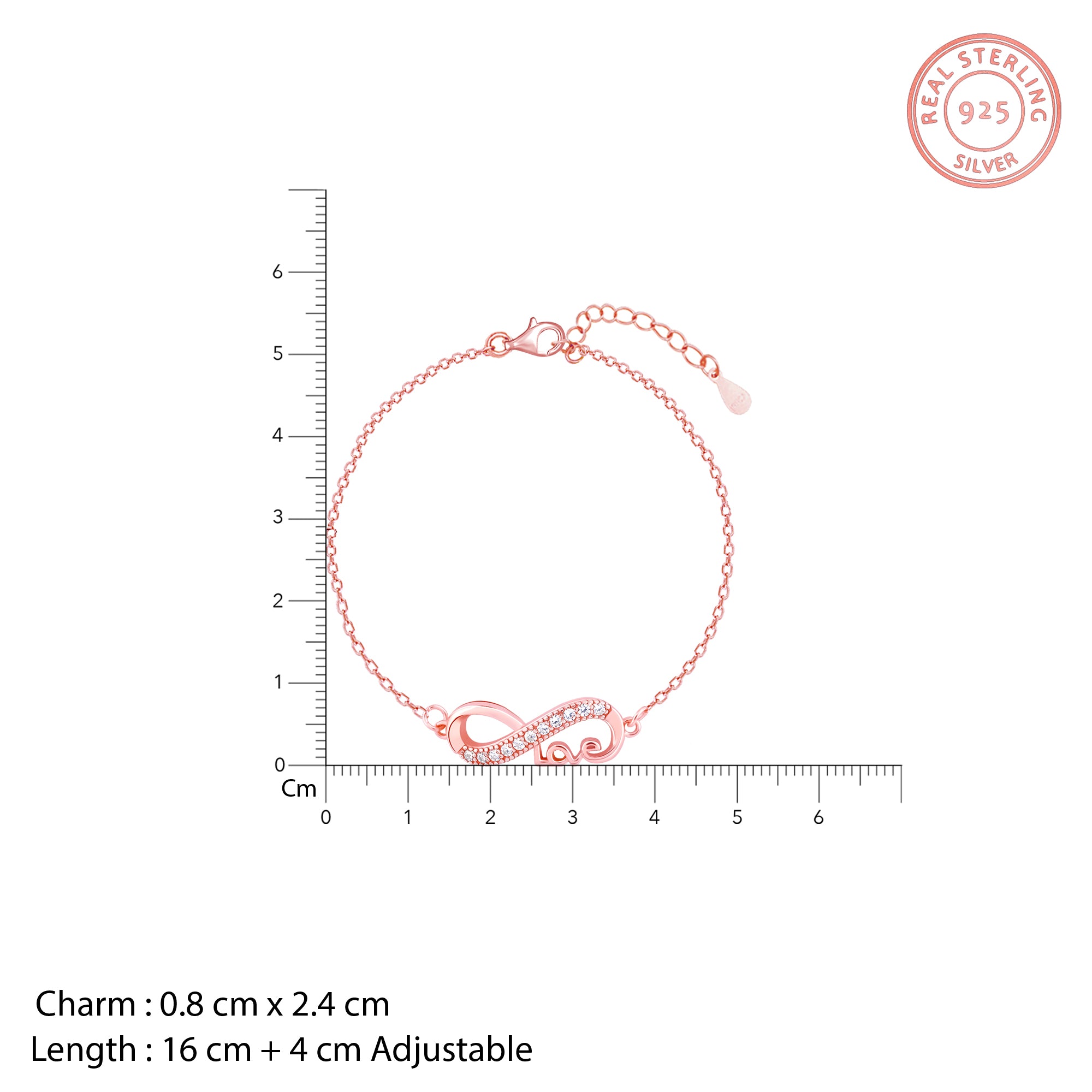The Inspiration: The Rose Gold Love That Knows No Bounds Bracelet takes inspiration from the thought that love lasts beyond a lifetime The Design: The delicate rose gold bracelet features a zircon studded infinity that carries love with 925 Silver with Rose Gold plating Hypoallergenic – Perfect for sensitive skin Charm Dimensions: 0.8 cm x 2.4 cm The length of the bracelet is 16 cm with a 4 cm adjustable portion Comes with the Nikrish Jewellery kit and authenticity certificate Net Qty- 1Â piece Styling Tip: Style this with a powder pink t-shirt and black jeans