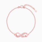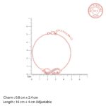 The Inspiration: The Rose Gold Love That Knows No Bounds Bracelet takes inspiration from the thought that love lasts beyond a lifetime The Design: The delicate rose gold bracelet features a zircon studded infinity that carries love with 925 Silver with Rose Gold plating Hypoallergenic – Perfect for sensitive skin Charm Dimensions: 0.8 cm x 2.4 cm The length of the bracelet is 16 cm with a 4 cm adjustable portion Comes with the Nikrish Jewellery kit and authenticity certificate Net Qty- 1 piece Styling Tip: Style this with a powder pink t-shirt and black jeans