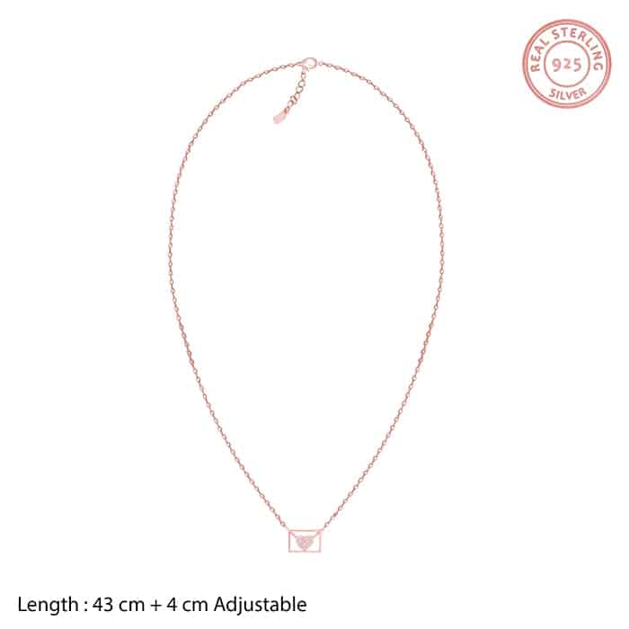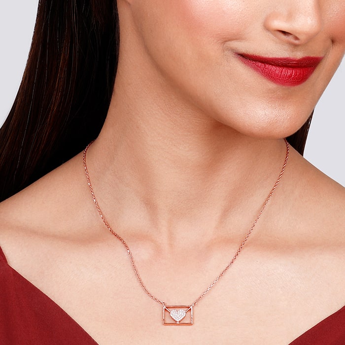 The Inspiration: The Rose Gold Love Letter Necklace is inspired by the sweet secret messages of love we write to our loved ones. The Design: The Rose Gold necklace has an envelope with a zircon studded heart. 925 Silver with Rose gold Plating AAA+ Quality Zircons Pendant Dimensions: 1.2 cm x 1.8 cm The length of the necklace is 43 cm with a 4 cm adjustable portion Hypoallergenic – Perfect for sensitive skin Comes with the Nikrish Jewellery kit and authenticity certificate Net Qty- 1 piece Styling Tip: Style this necklace with a baby pink peplum dress.