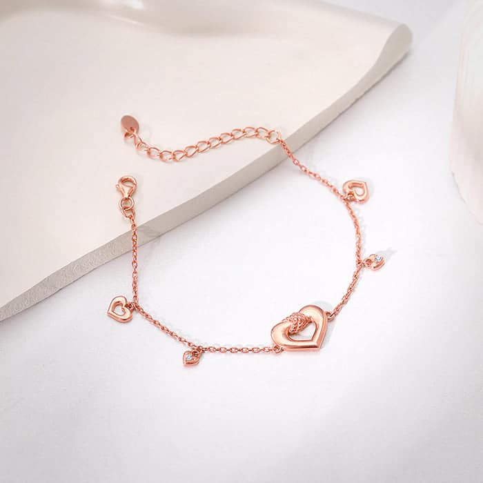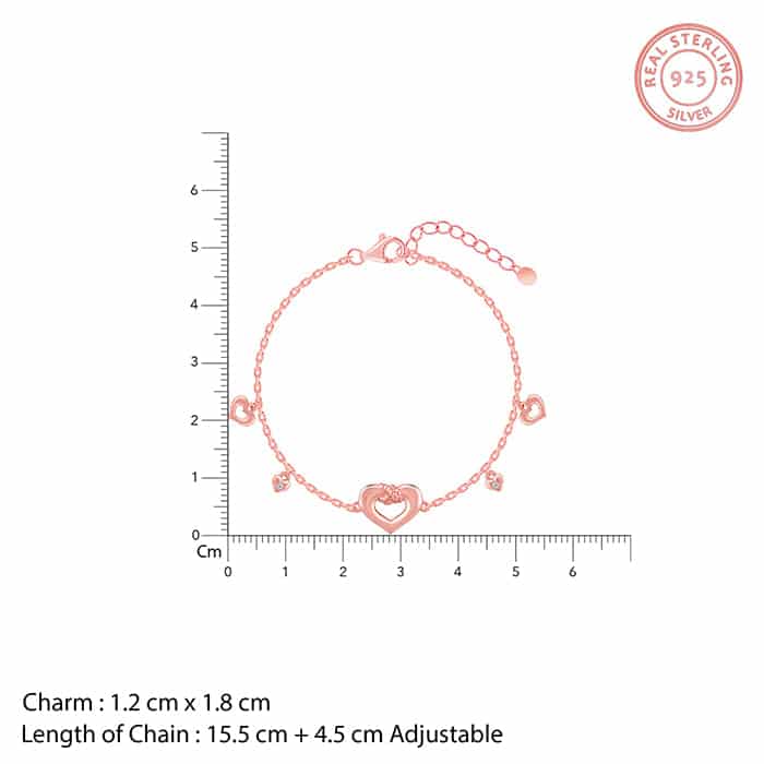 The Inspiration: Celebrate the ties that bind—this bracelet is a symbol of enduring love. The Design: This rose gold bracelet for women features a knotted heart motif at the centre, with small hearts dangling on both sides of the chain. Fall in love all over again with our exclusive Valentine’s Collection: #WhatTheHeartWants. Here are our curated designs that will speak to your heart. 925 Silver With Rose Gold Plating Perfect for sensitive skin Motif Height: 1.2 cm, Width: 1.8 cm Length of Chain: 15.5 cm + 4.5 cm Adjustable Comes with the Nikrish Jewellery kit and authenticity certificate Content: Bracelet Net Qty- 1 unit Styling Tip: Wear this with a pink one piece.