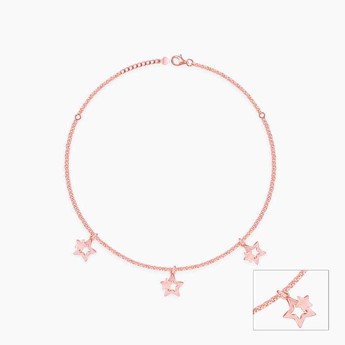 The Inspiration: The star charms intricately intertwined with one another, symbolises the unity, harmony and interconnectedness of the universe. An ideal choice for gifting for yourself or others. The Design: This rose gold anklet has star motifs that appear like merging with each other. 925 Silver with Rose Gold Plating Perfect for sensitive skin Length of Chain: 25 cm + 4 cm Adjustable Motif Height: 0.8 cm, Width: 0.7 cm Comes with the Nikrish Jewellery kit and authenticity certificate Content: Anklet Net Qty- Single or pair, as chosen by you! Styling Tip: Pair it with palazzo style pants.