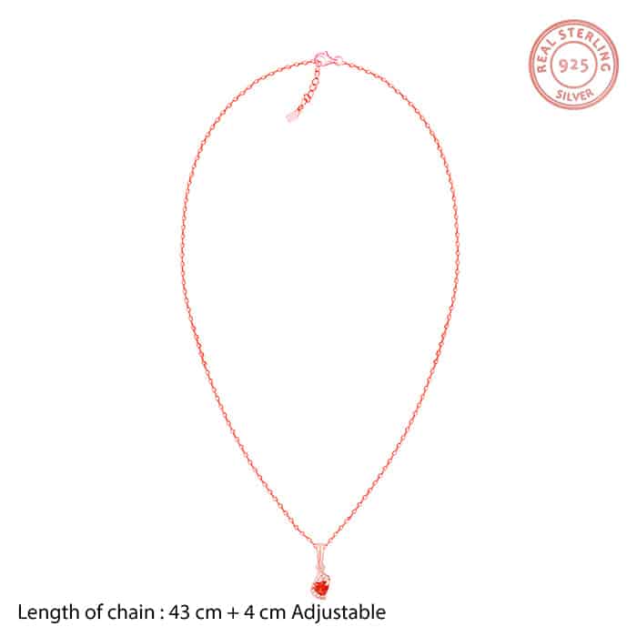 The Inspiration: Your passion is made pretty with this pendant. Gift this to your special friend to say that “we’re united by hearts” The Design: This rose gold pendant features a red stoned heart motif clutched within an elegant design. 925 Silver with Rose Gold Plating Perfect for sensitive skin Length of chain: 43 cm + 4 cm Adjustable Motif Height: 1.8 cm, Width: 0.6 cm Comes with the Nikrish Jewellery kit and authenticity certificate Content: Pendant With Link Chain Net Qty- 1 unit Styling Tip: Style this pendant with a red satin dress.