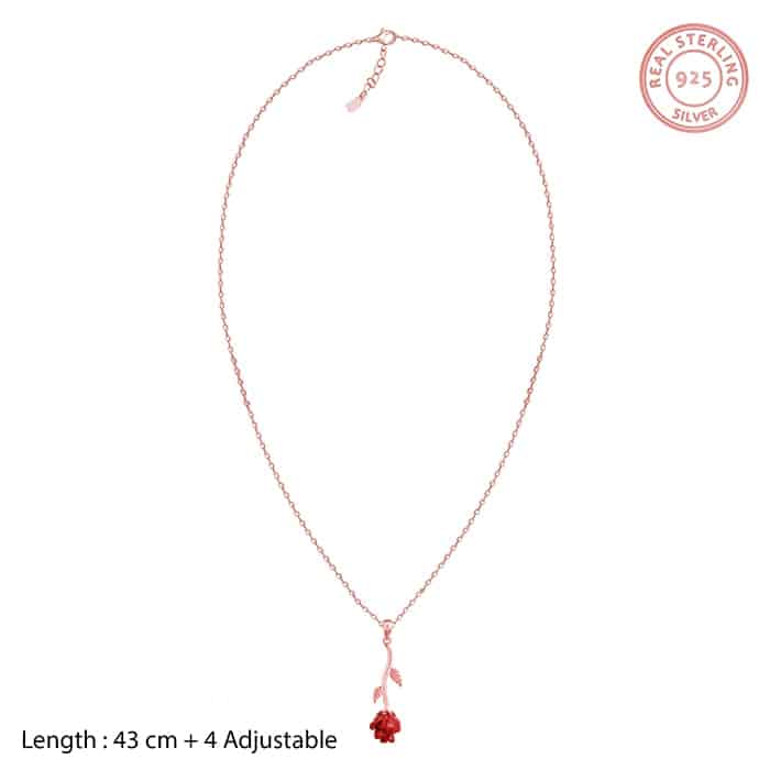 The Inspiration: The Rose Gold Red Rose Pendant is inspired by the rose from the story of Beauty and the Beast. The Design: The Rose Gold pendant has a beautiful half-bloomed red rose with a stem and leaves. 925 Silver with rose Gold Plating Pendant Dimensions: 4.0 cm x 0.9 cm The length of the necklace is 43 cm with a 4 cm adjustable portion Hypoallergenic – Perfect for sensitive skin Comes with the Nikrish Jewellery kit and authenticity certificate Net Qty- 1 piece Styling Tip: Style this pendant pastel blue deep-neck maxi dress.