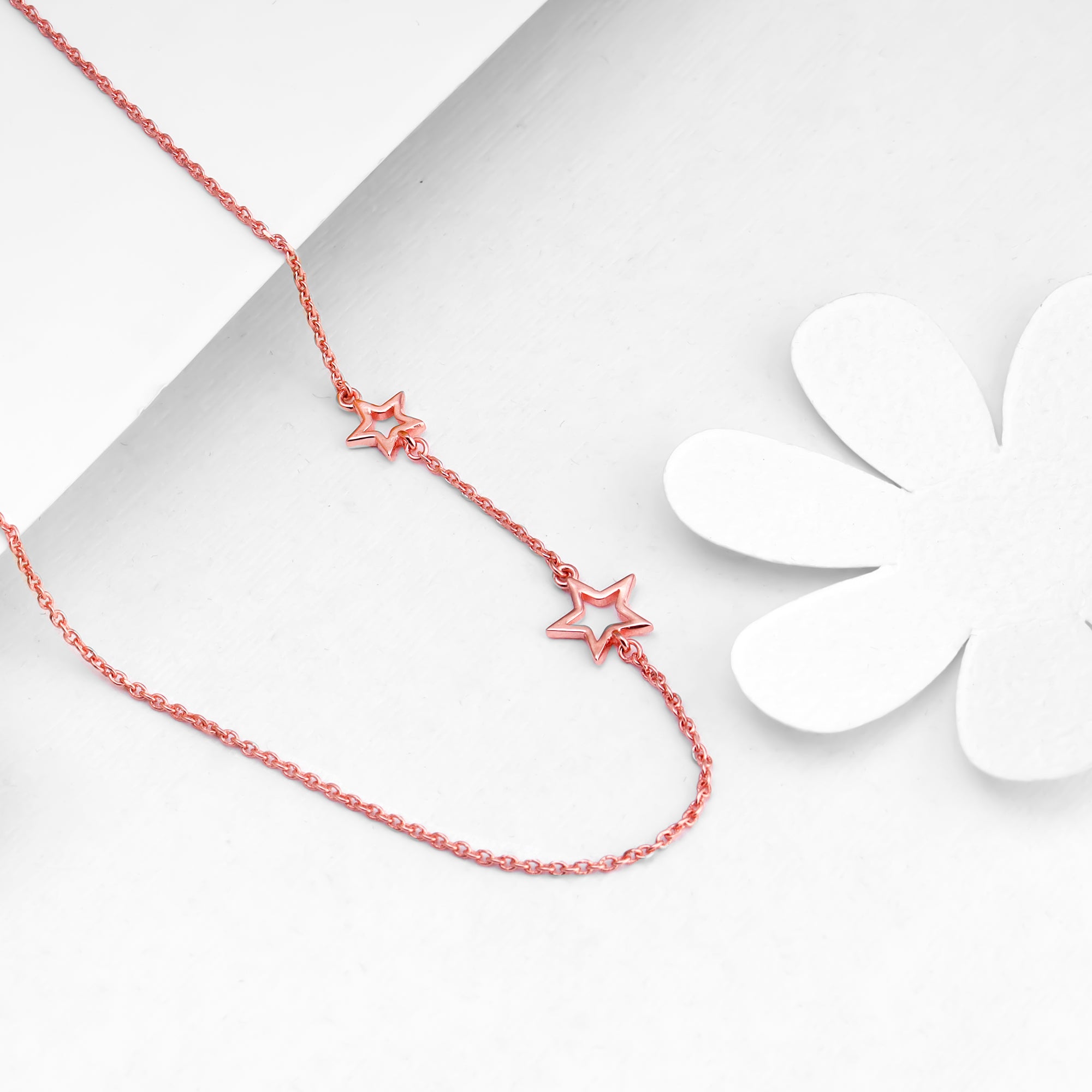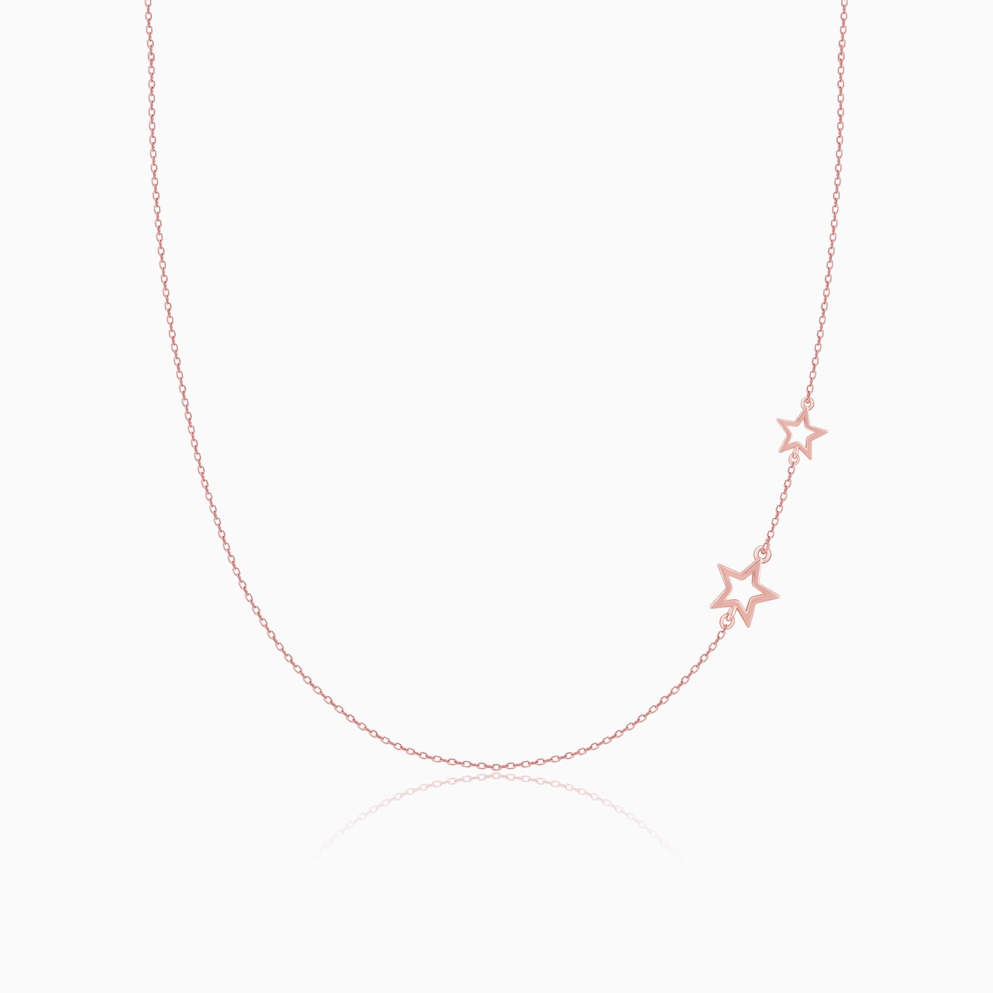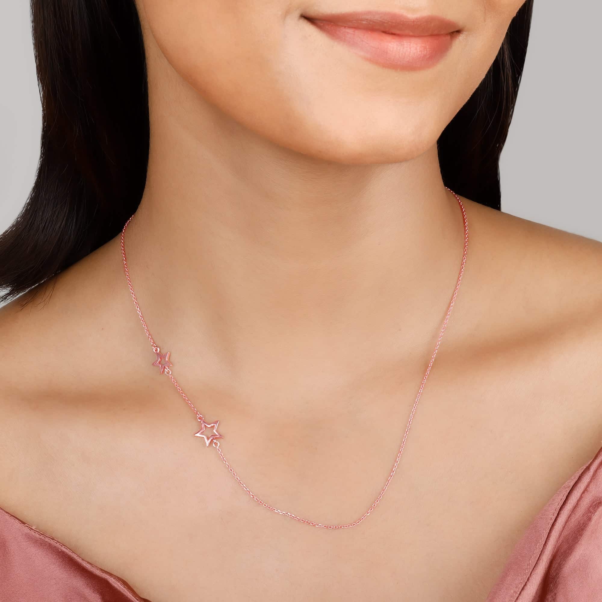 The Inspiration: The Rose Gold Star Crossed Lovers Necklace is inspired by how the universe truly conspires to bring the right person into your life when the time is just right. The Design: The rose gold necklace has two-star designs on the side of the chain making it an interesting piece. 925 silver with Rose Gold plating Perfect for sensitive skin Length of the necklace is 45 cm with 5 cm adjustable portion Dimensions: 1.2 cm x 1 cm Comes with the Nikrish Jewellery kit and authenticity certificate Net Qty- 1 piece Styling Tip: Wear a champagne corset mini dress with side ruching.