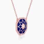 The Inspiration: The Rose Gold Taj Mosaic Necklace is inspired by the beautiful mosaic art seen on the mighty Taj Mahal. The Design: The rose gold necklace features a hexagonal design with blue enamel studded with zircons. 925 Silver with Rose Gold plating The length of the necklace is 43 cm with a 4 cm adjustable portion Charm Dimensions: 1.7 cm x 1.7 cm Comes with the Nikrish Jewellery kit and authenticity certificate Net Qty- 1 piece Styling Tip: Style this with a red maxi dress.