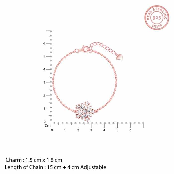 The Inspiration: Treat yourself to a shopping extravaganza! This is the perfect piece to glam up your everyday look. The Design: This rose gold bracelet features a snowflake motif with zircons. 925 Silver with Rose Gold Plating Perfect for sensitive skin Charm: 1.5 cm x 1.8 cm Length of Chain: 15 cm + 4 cm Adjustable Comes with the Nikrish Jewellery kit and authenticity certificate Content: Bracelet Net Qty- 1 unit Styling Tip: Pair this with a blue midi dress.