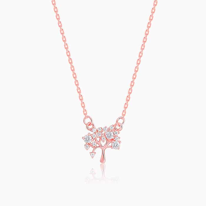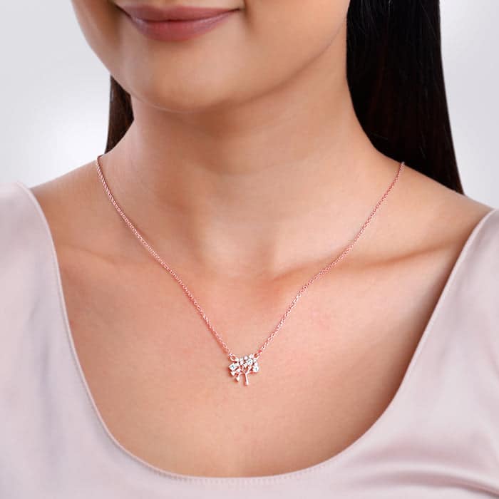 The Inspiration: This rose gold pendant tells the story of growth and transformation. Wear it and feel empowered by your own journey. The Design: The rose gold pendant for women features a tree design with branches adorned with sparkling zircons, symbolising leaves. 925 Silver with Rose Gold Plating Perfect for sensitive skin Motif Height: 1.6 cm, Motif Width: 1.5 cm Length of Chain: 43 cm + 6 cm Adjustable Comes with the Nikrish Jewellery kit and authenticity certificate Content: Necklace Net Qty- 1 unit Styling Tip: Team this with a shimmering party wear outfit.