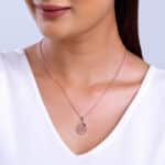 The Inspiration: Make a statement on your next date night, with this stylish and understated piece. The Design: This rose gold pendant with a link chain features an interlocked circular motif, partially studded with zircons. 925 Silver with Rose Gold Plating Perfect for sensitive skin Motif Height: 2.5 cm, Motif Width: 1.5 cm Length of Chain: 43 cm + 4 cm Adjustable Comes with the Nikrish Jewellery kit and authenticity certificate Content: Pendant with Link Chain Net Qty- 1 unit Styling Tip: Style this with a peach bodycon dress.