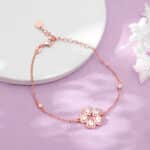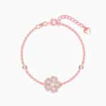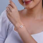 The Inspiration: Let this bracelet be a constant reminder of your unwavering affection. A beautiful expression of your love and admiration. The Design: This rose gold bracelet features a flower motif with heart-shaped petals studded with zircons. 925 Silver with Rose Gold Plating Perfect for sensitive skin Dimensions: 1.5 cm + 1.65 cm Adjustable Length of Chain: 15.5 cm + 4 cm Adjustable Comes with the Nikrish Jewellery kit and authenticity certificate Content: Bracelet Net Qty- 1 unit Styling Tip: Style this with a black skirt and a white shirt.