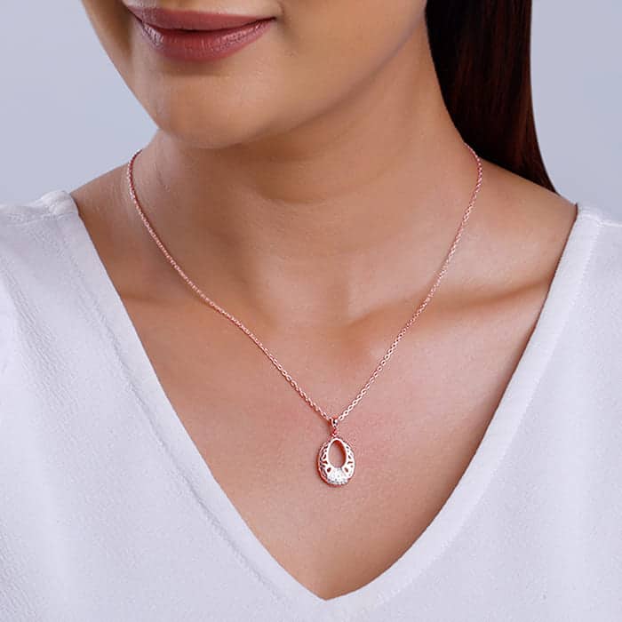 The Inspiration: Become the party show-stopper with this exquisite pendant, crafted to complement your style. The Design: This rose gold pendant with a link chain is oval-shaped featuring an intricate design and zircons studded towards the bottom. 925 Silver with Rose Gold Plating Perfect for sensitive skin Motif Height: 2.5 cm, Motif Width: 1.4 cm Length of Chain: 43 cm + 4 cm Adjustable Comes with the Nikrish Jewellery kit and authenticity certificate Content: Pendant with Link Chain Net Qty- 1 unit Styling Tip: Pair this with an orchid violet tunic dress.