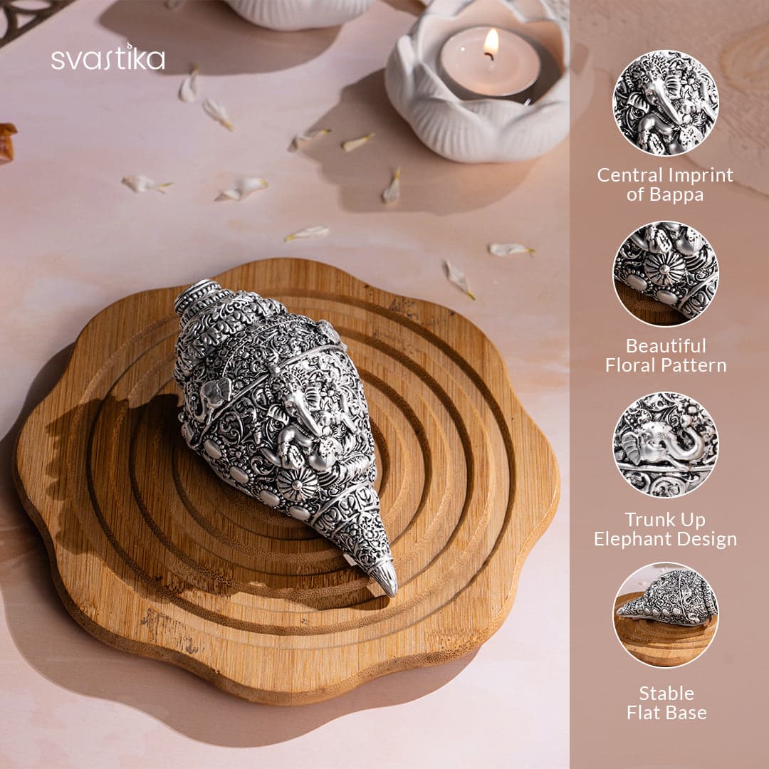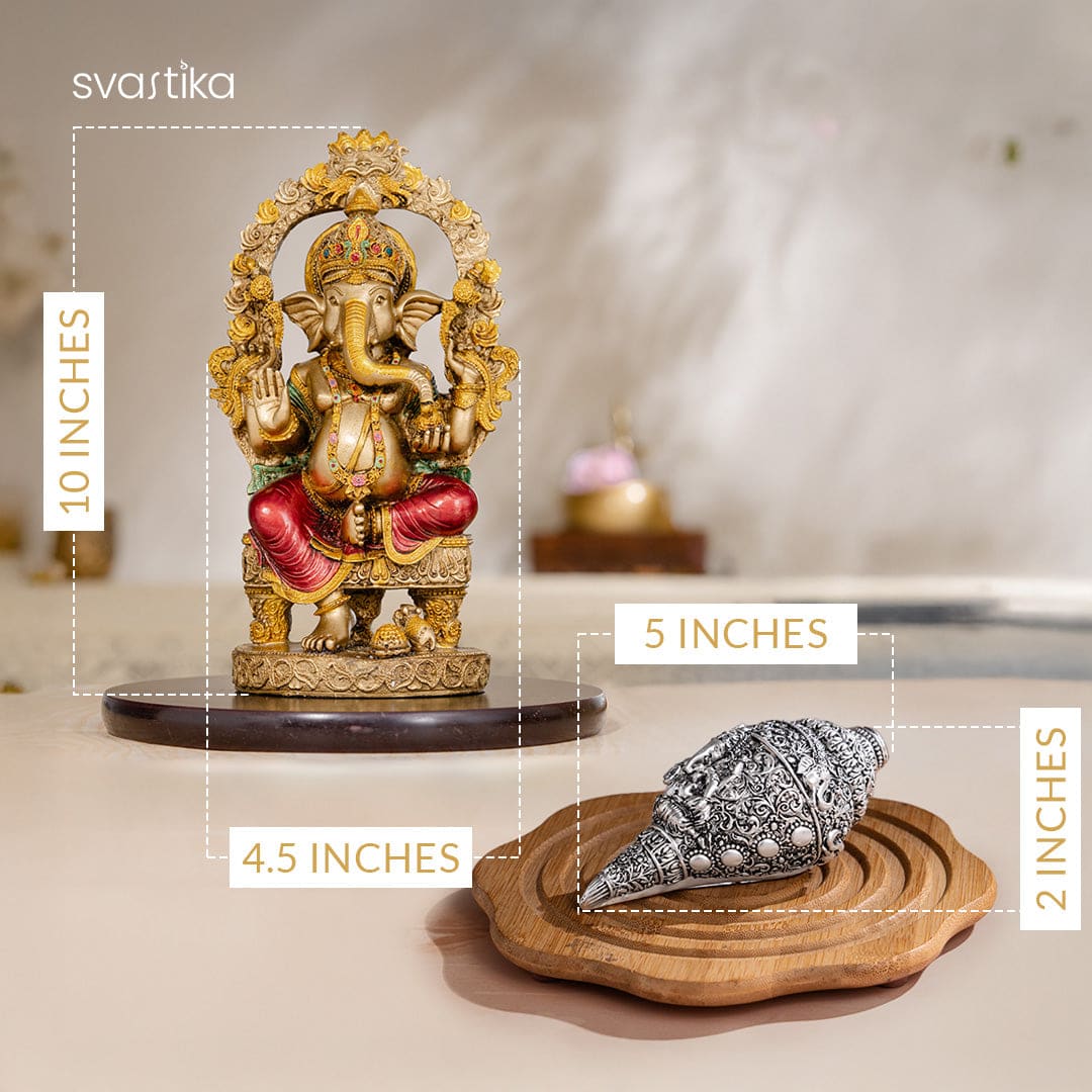 Rustic Ganesha Antique Murti (10 Inch) with Ganesh Shankh (Conch) – Silver Plated (5 Inch) – Combo