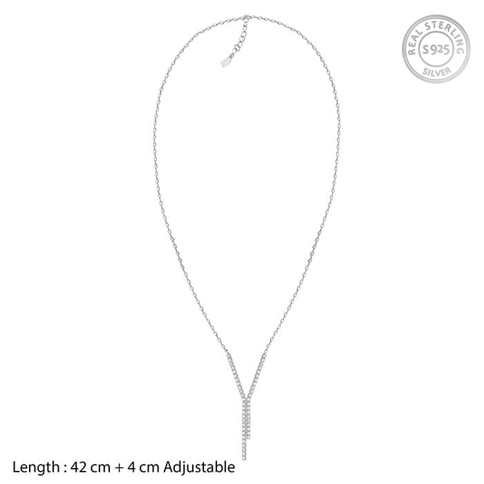 The Inspiration: The Silver Collide Necklace is inspired by when our paths cross with someone and we realize that they are the ones we want to spend our lives with. The Design: The silver necklace has zircons studded on the necklace with a y-shape at the end. 925 Silver AAA+ Quality Zircons Dimensions: 6.3 cm x 0.5 cm The necklace length is 42 cm and the adjustable chain is 4 cm Rhodium finish to prevent tarnish Comes with the Nikrish Jewellery kit and authenticity certificate Net Qty – 1 unit Styling Tip: Style this with a plunging neckline maroon dress.